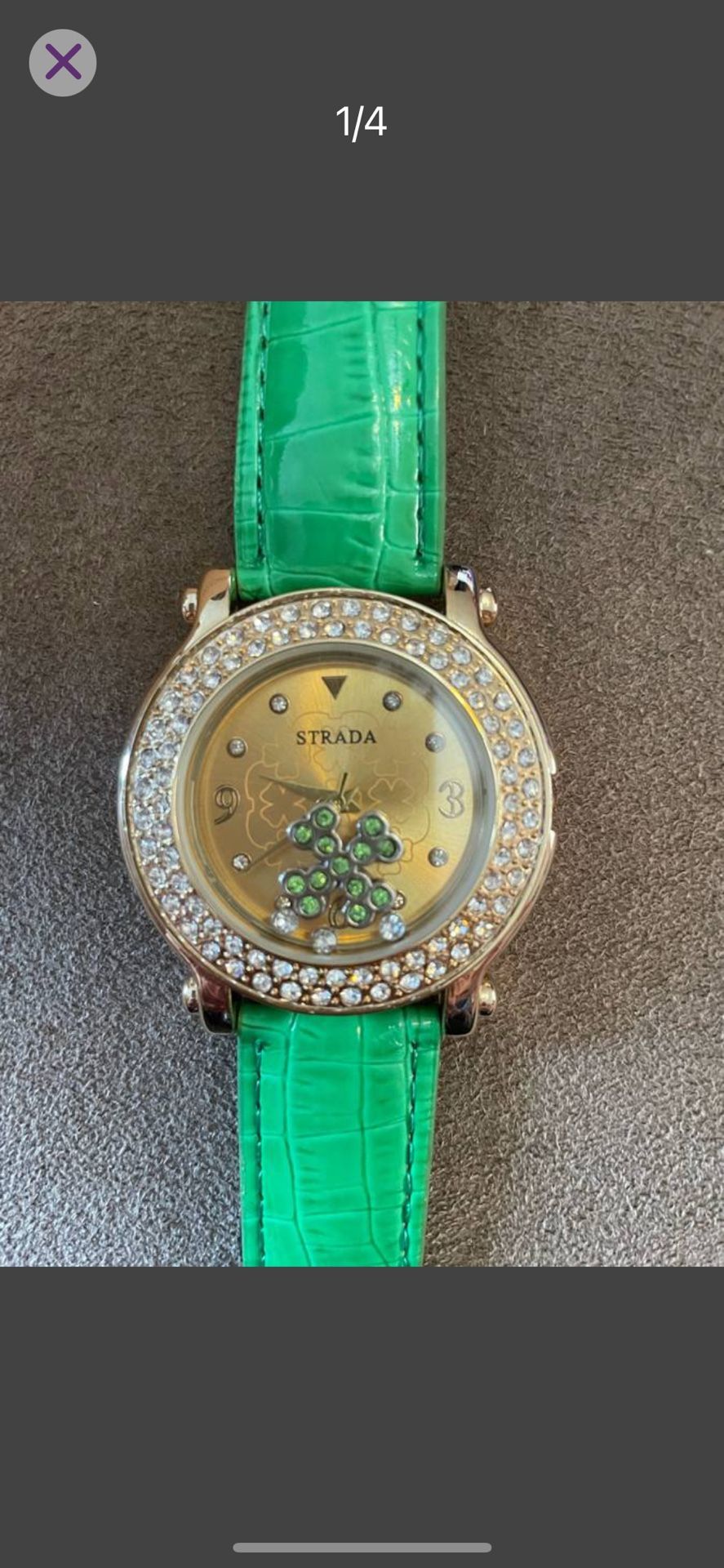 Strada brand crystal watch featuring a green faux leather strap and a round dial with a floating clover -Needs new battery
