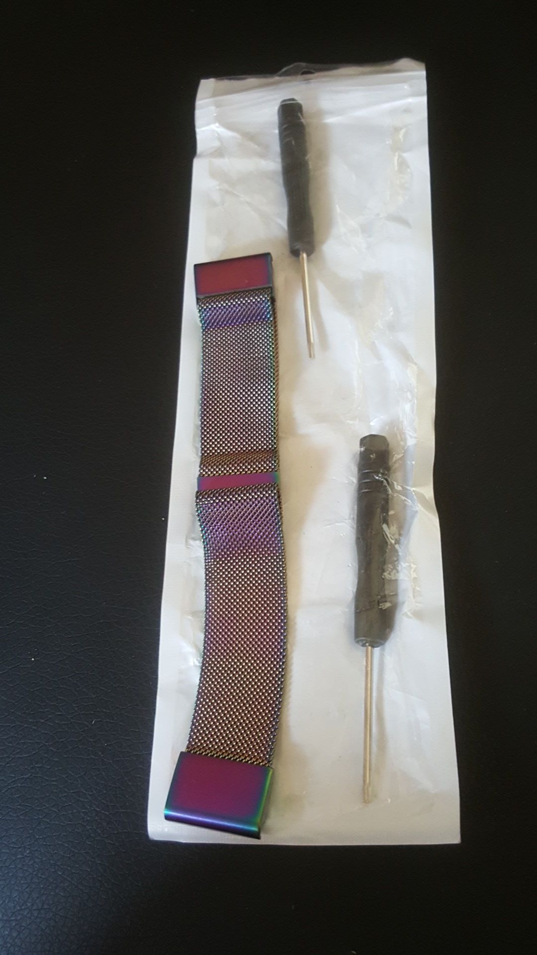 The band comes with two screw drivers. Multi-colored band with pinkish hues.