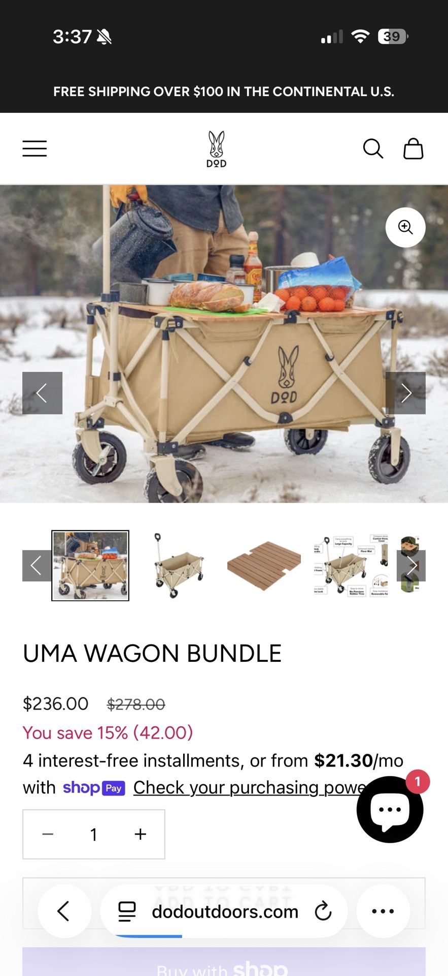 Excellent Condition – Complete Camping Wagon & Table Set Selling our DOD Outdoors UMA Wagon Bundle. This is a premium Japanese-designed folding wagon that includes the custom wood slat tabletop, allowing it to double as a sturdy dining or prep table at the campsite. Included in this bundle: • Heavy-duty folding wagon (Tan color) • Roll-up wood tabletop • Storage bags for both wagon and table Features: • Versatile: Use it to haul gear, then convert it into a table. • Large Capacity: Huge storage space with a high weight limit. • Compact: Folds down easily to fit in your trunk. • Condition: Gently used, clean, and fully functional. Stored indoors.