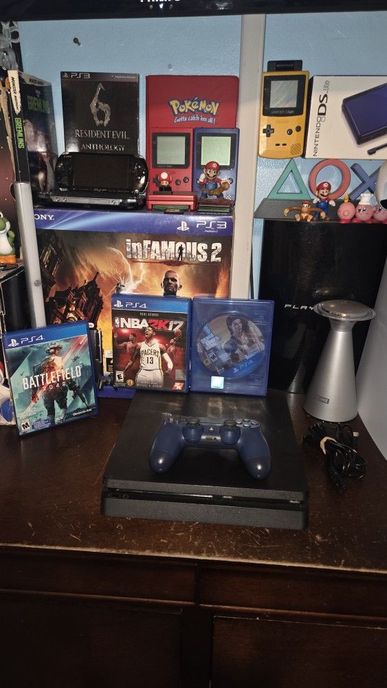 PS4 Slim 500GB 1 Controller ( awesome blue color) Controller charging cable Power cable 3 Games: Battlefield 2024 NBA2K17 Grand Theft Auto V Five Tested and working