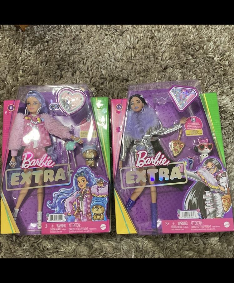 (2) Barbie doll extra from Mattel (1) Barbie Extra Fashion Doll #15 with 15 Accessories (1) Barbie Extra Fashion Doll #6 with 15 Accessories Measures approximately 12 inches tall