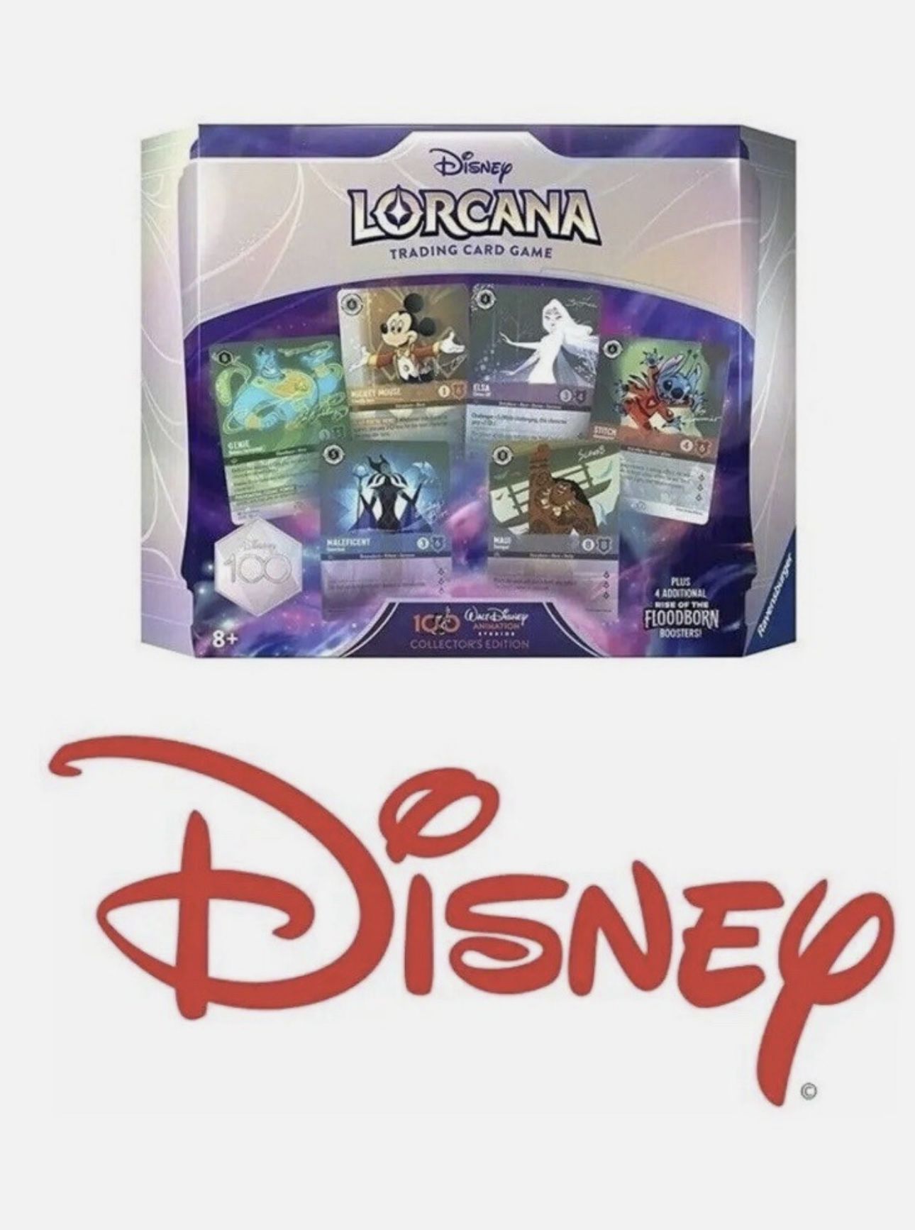 Lorcana is Disney’s collectible card game inspired by the character designers at Walt Disney Animation Studios, who draw animations in ink. This lot has four Disney Lorcana TCG Disney100 Collector's Edition packages featuring the card game’s second set: Rise of the Floodborn. Each package includes six exclusive holographic cards with never-seen-before images of Mickey Mouse, Elsa, Stitch, Genie, Maui, and Maleficent. Also, each package has booster packs of additional game cards, four booster packs with 12 cards each. The number of cards in this lot makes it stand out. Altogether, there are 24 foil-finished character cards and 192 Floodborn game cards! The Disney Lorcana TCG Disney100 Collector's Edition Rise of the Floodborn Booster Pack was released on Dec 1, 2023
