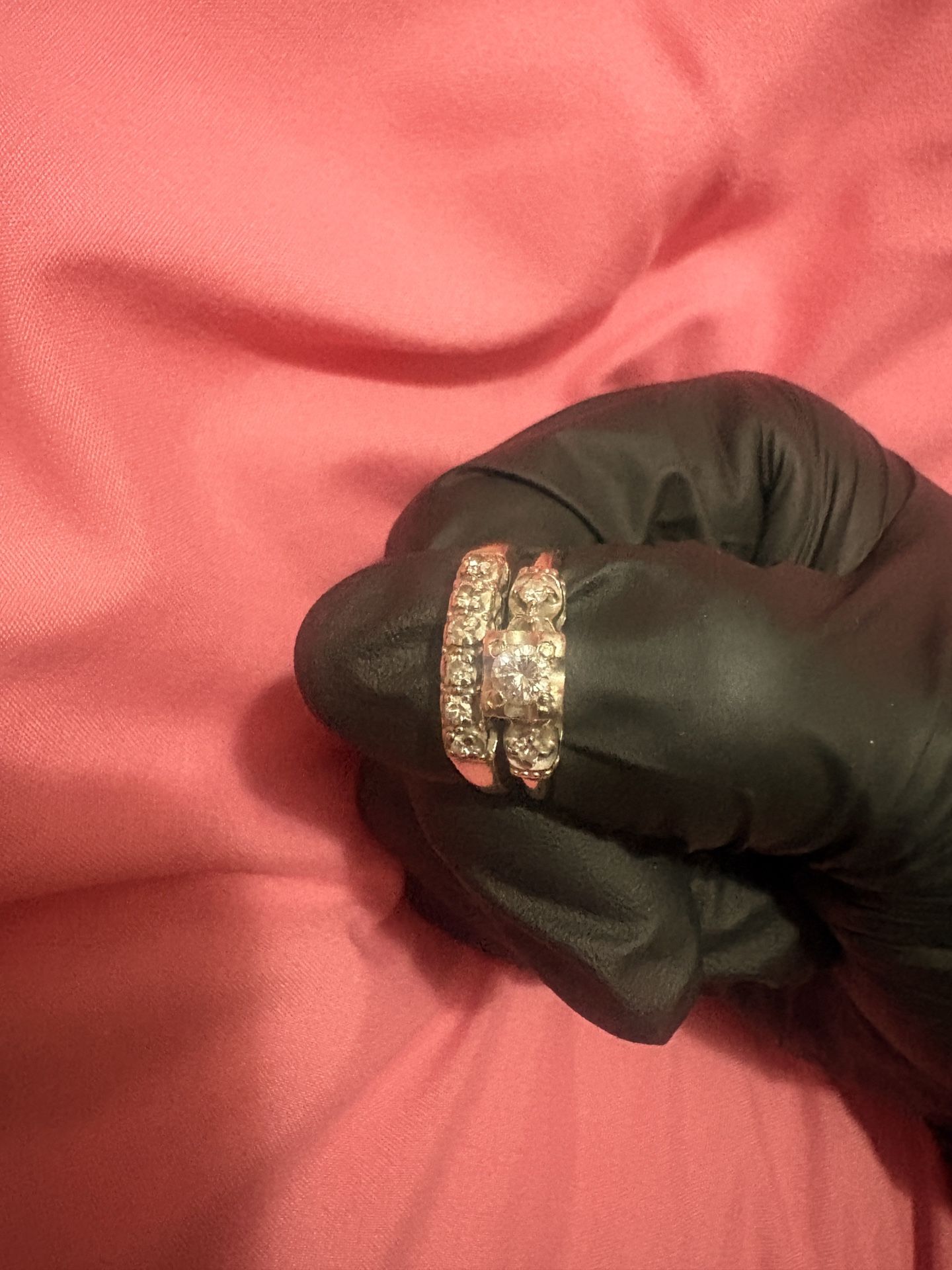 Beautiful authentic vintage 14K solid gold diamond wedding set, featuring a raised square cluster engagement ring paired with a matching diamond band. This timeless mid-century bridal set showcases classic craftsmanship and elegant detail rarely seen in modern lightweight jewelry. ✨ Details: • Metal: Solid 14K Gold (Stamped “14K PAT”) • Total Weight: Approx. 4+ grams combined • Style: Vintage Mid-Century Bridal Set • Diamonds: Natural round-cut diamonds • Engagement Ring: Raised square cluster setting designed to create the look of a larger center stone • Wedding Band: Matching diamond band with prong-set accent stones • Color: Yellow gold with white gold illusion-style head (traditional vintage look) • Estimated Size: Approx. 6.5–7 (can be resized by a jeweler) 💎 Design Features: The engagement ring features a sparkling square cluster made of multiple natural diamonds, giving the appearance of a larger center diamond while maintaining durability and brilliance. The raised setting allows maximum light reflection for extra sparkle. The matching band complements the engagement ring perfectly with additional round diamonds set along the front, creating a cohesive and elegant bridal look. 🕰 Era & Style: Likely dating from the 1950s–1970s, this set reflects classic American mid-century bridal design. The “PAT” stamp indicates a patented setting design, common in vintage fine jewelry. ✔ Solid gold – not plated or filled ✔ Real diamonds ✔ Estate/vintage piece ✔ Perfect for engagement, anniversary, or heirloom gift A beautiful timeless set with vintage history Serious inquiries only. TAKING OFFERS❗️