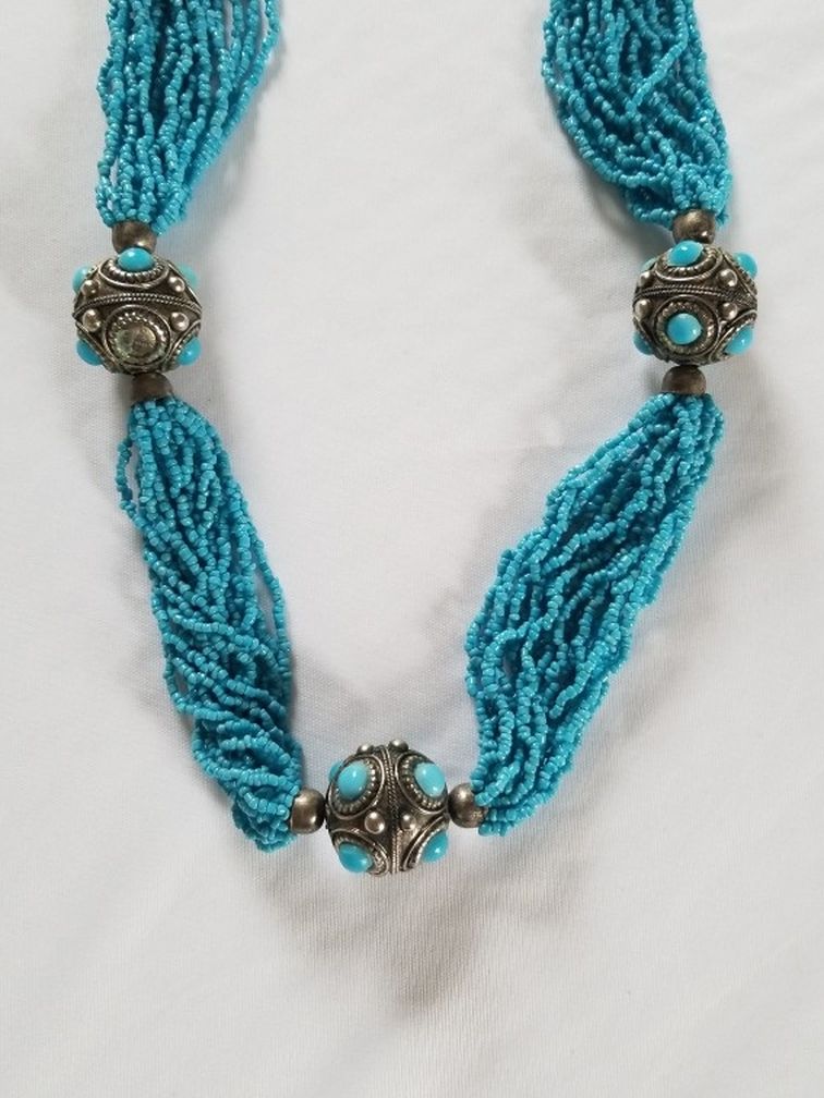 Pretty turquoise blue BEADED necklace. I noticed one of the cabochon stones (plastic) is missing as shown in photo. Still pretty. Pick up S. Marysville