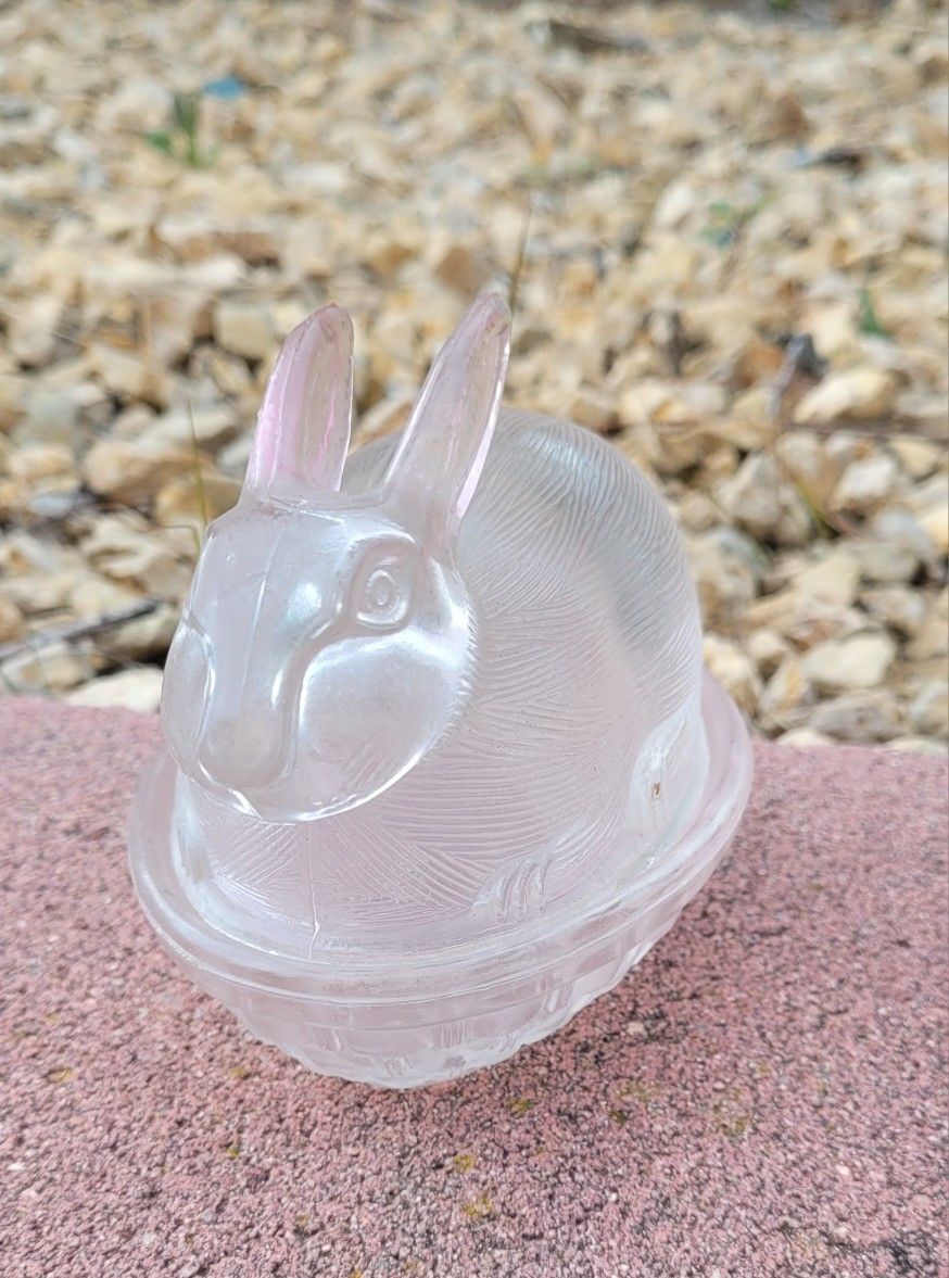 Preston Scott pink glass bunny on a basket candy/trinket dish.