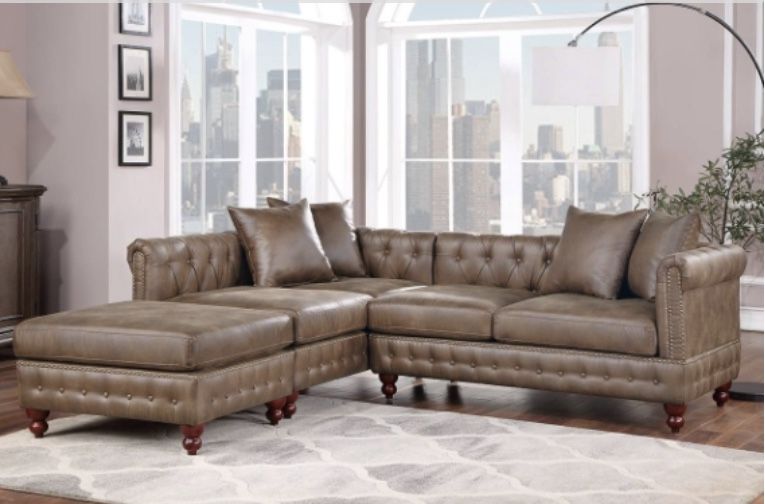 Sectional Sofa Item # 489 Color: Dark Coffee Material: Breathable Leatherette Dimensions: Sectional: 95″W x 92″L x 30″H Ottoman: 34″ x 31″ x 20″H Available in Dark Coffee and Slate Grey Some Assembly Required Includes: F8945 X 2 Chaise Lounge + F8946 X 1 Ottoman