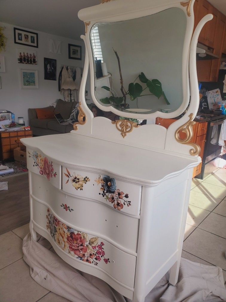 Antique modernized vanity dresser! This is solid wood hand painted gold trim piece. It has 4 drawers and it's very sturdy. This is a one of a kind. It has its original furniture casters that compliments it's look. There are no replicas of this piece. Asking for the selling price, but if you love it, im willing to negotiate. Delivery is available in the Bay Area.