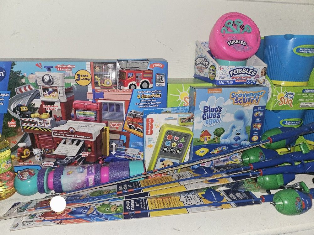 Bubble Machine $6 Each Fishing Rod For Kids $6 Each Firehouse Playset $15