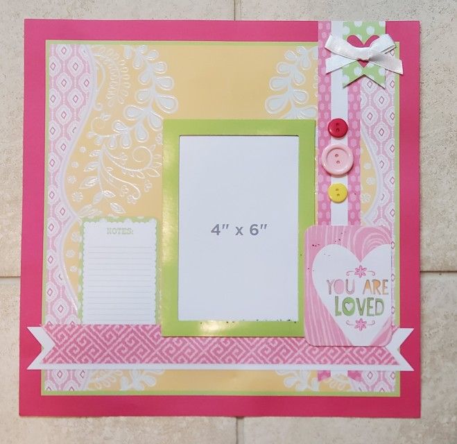 12" x 12" Pre-made Scrapbook Page Plenty of space for photos, stickers, and writing Frame for photo provided on page
