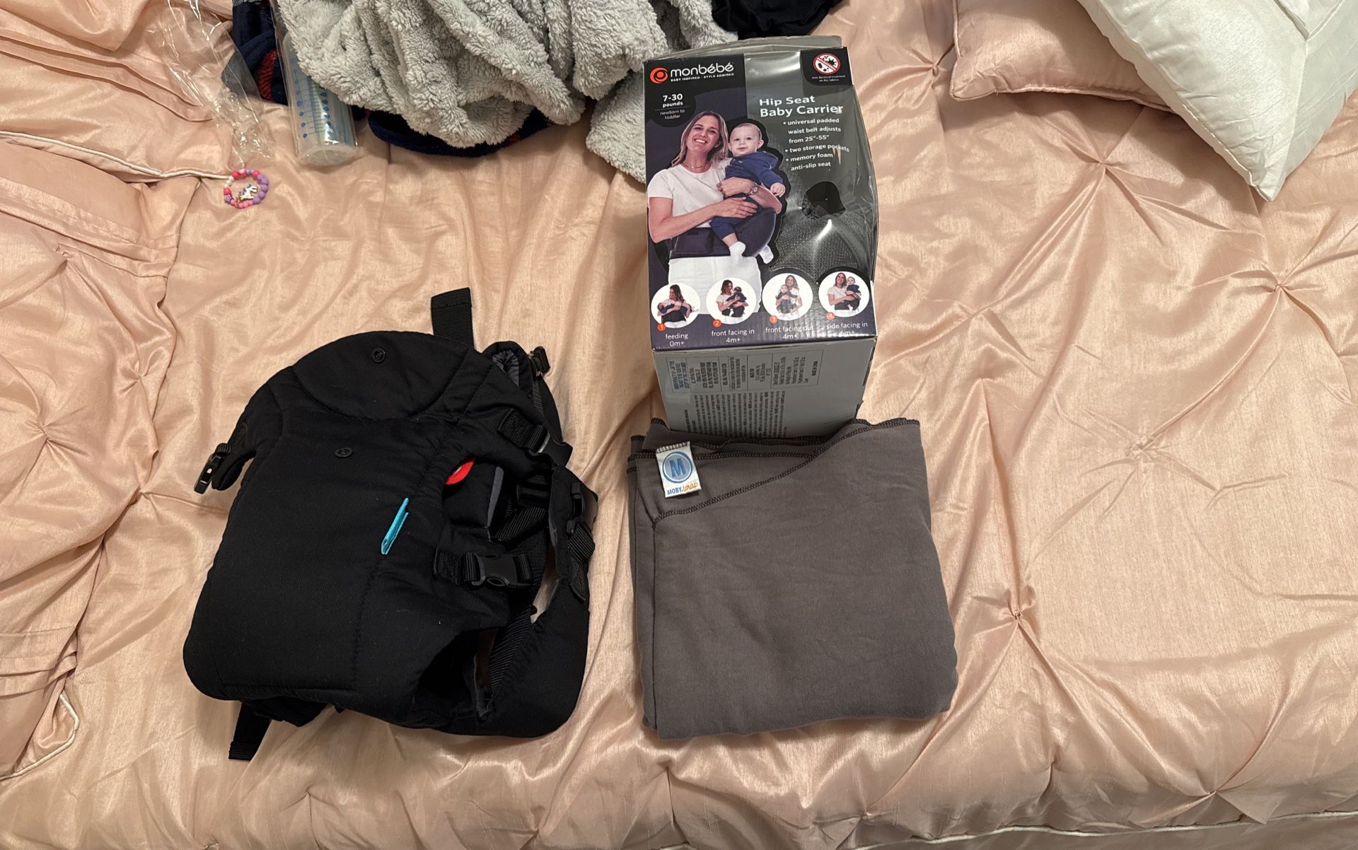 I have these baby items for sale. The Infantino flip I only used a couple times. My baby did not like it. I also have a Moby wrap which I only used twice as well and I also have the hip seat baby carrier, which was really helpful for my back! My baby is crawling now and doesn’t really want to be held up. I am selling each item for $10 each or $25 for all or best offer! All items are in great new condition!