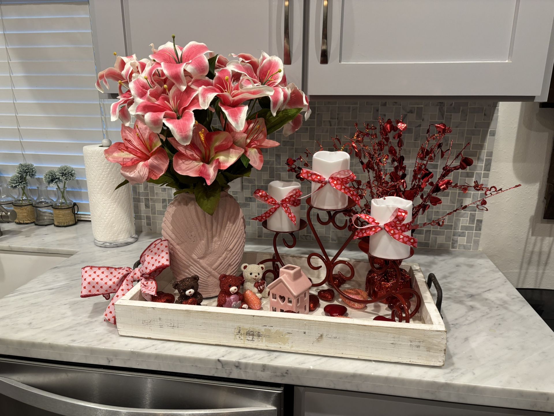 Large white wood tray measuring 24 in L x 12 in D x 3 in H, with handles, decorated with pink vase filled with pink lilies of the valley, three ceramic valentine bears, three candles on metal stand, and sparkly heart filler for tray. Everything included. I’m in the sugarland Missouri city area.