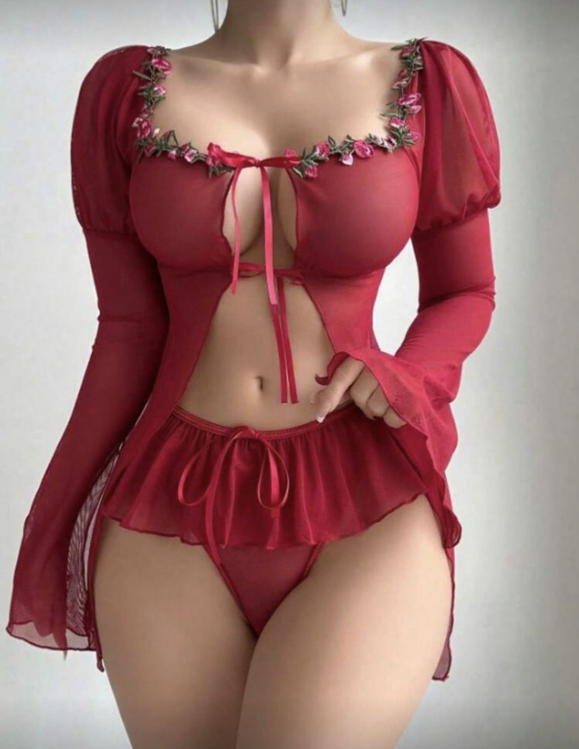 Women's New Charming Semi-Transparent Lingerie Nightdress Set, Floral Square Neck, Top With Hollow Chest And Bell Sleeves, Elegant And Comfortable Nig