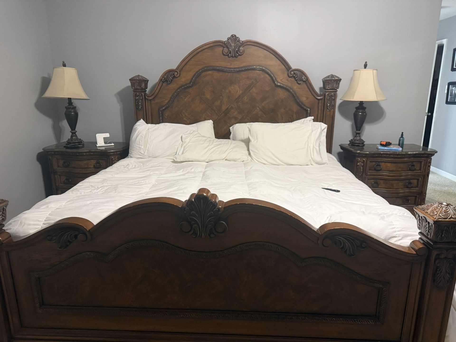 5 piece bedroom set with stone top. Excellent t condition! Two night stands 31 x 32 Two dressers 62 x King bed 90 inches long and 83 wide