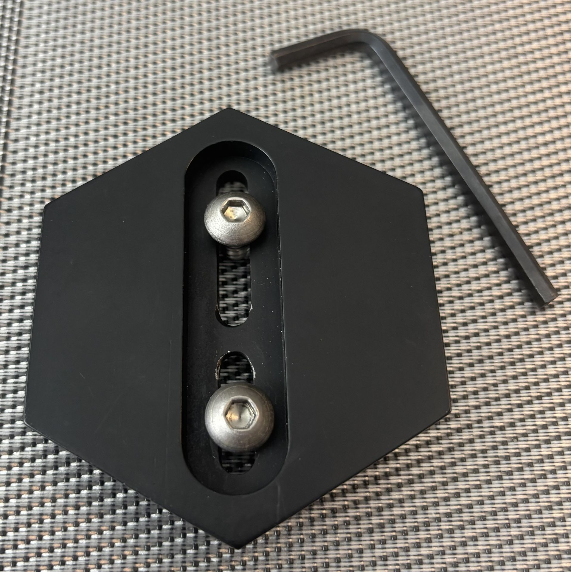 Camera tripod/lens QR plate - 5/32” hex - 3”tall x 2 5/8” wide/diagonal - 2 1/2” long x 5/8” wide top interior recessed opening - 1.25” long x .25” wide and .75” long x .25” wide bottom hex openings - aluminum construction - unknown manufacturer & model number - includes hex wrench - previously owned, like new condition - $10.