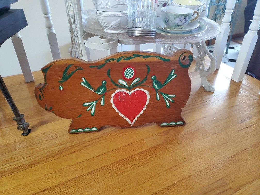Great looking folkart painted piggy cutting board. Perfect for hanging in your primitive, vintage kitchen or pantry. Measures almost 17" wide x 8 3/4" tall. Love the wonderful painted folkart birds and heart. Please see other little piggy we have posted. Thanks for looking.
