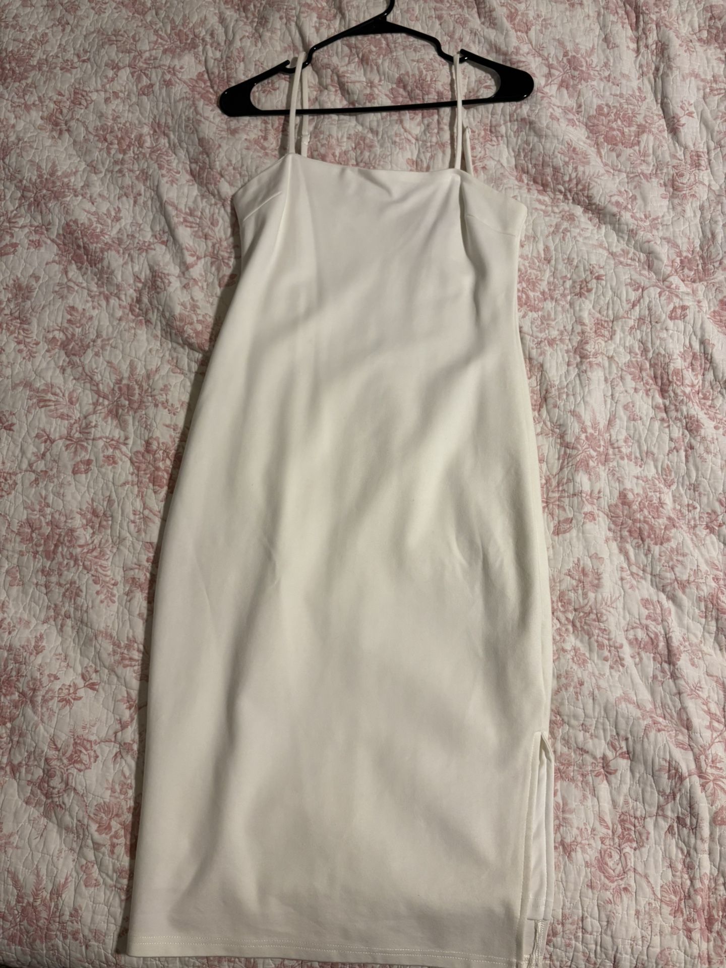 Originally purchased as my elopement dress but went with something different has never been worn out. It is a maxi dress and fits snug