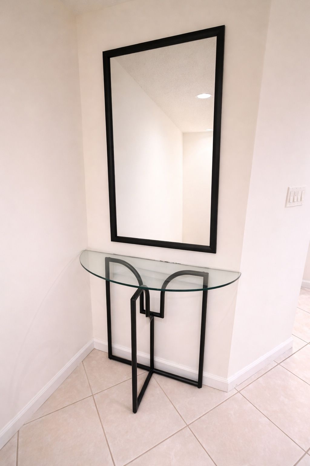Beautiful glass & metal console table with mirror for your entrance. Simple, clean and modern.
