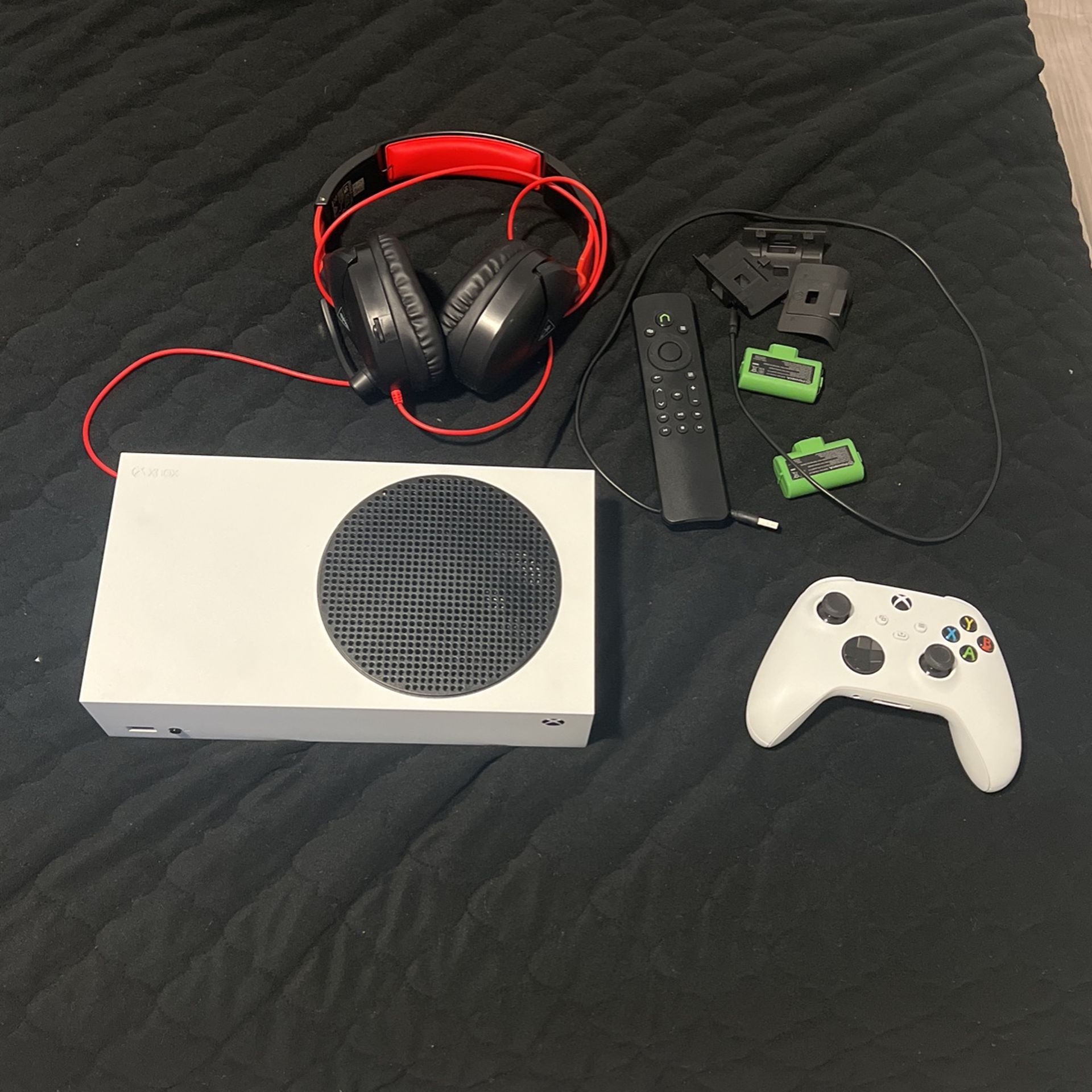 It comes with 2 rechargeable batteries set and 3 adapter covers also some practically new turtle beach headphones , and a remote control . I’m just selling it because I never use it to be honest and it just takes space