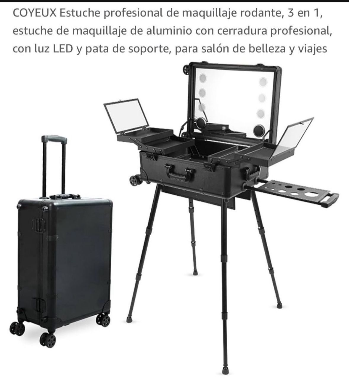 COYEUX Estuche profesional de maquillaje rodante, 3 en 1, estuche de maquillaje de aluminio con cerradura profesional, con luz LED y pata de soporte,