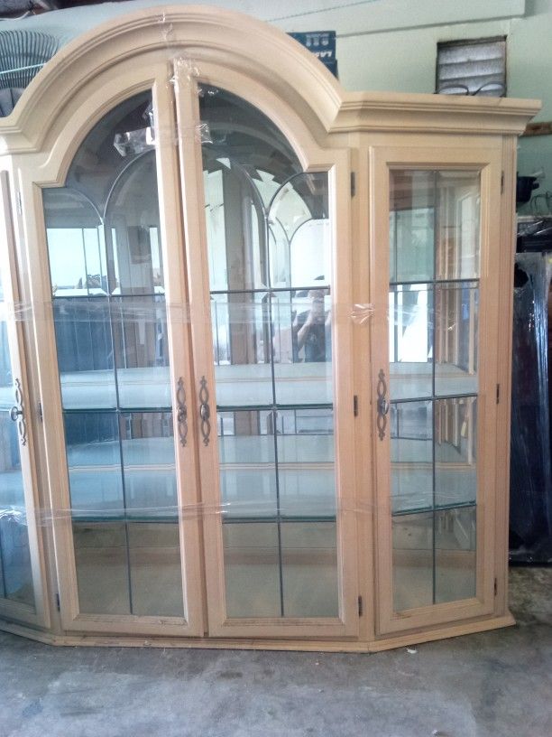 Beautiful wooden China set with glass shelves and mirror in background. Nothing is broken or scratched everything is in perfect condition. Also has lighting inside China set. Can come and look at it. Price is negotiable.