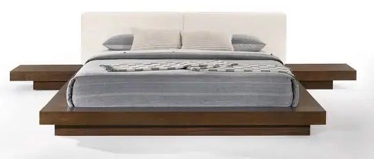 Smoke free home. California Mattress and Bed Frame. Bed frame 97” long 89” wide without side pieces Side pieces each 23 1/2 inches Total width with side pieces 136 “ Fabric headboard