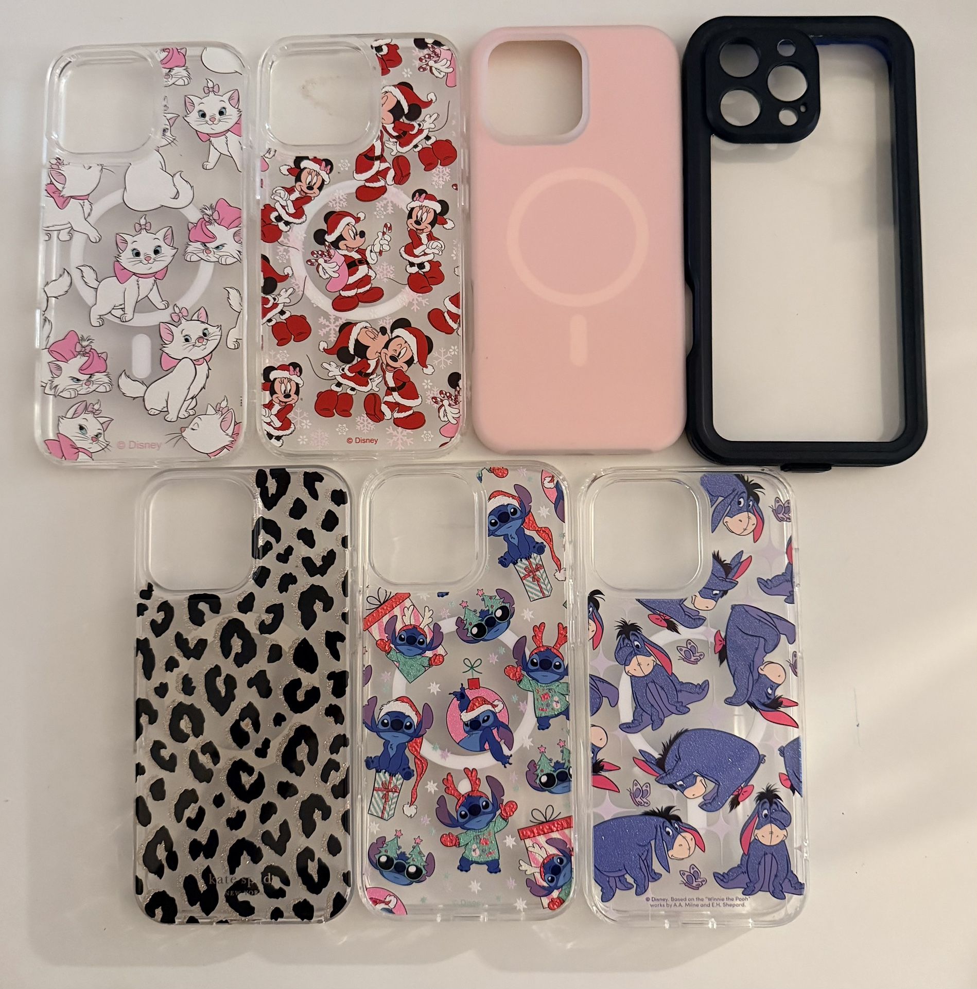 $10 each or $40 for all cases are in mint condition never dropped no knicks etc. character cases never used cheetah print— KATE SPADE top row far right— waterproof case **selling because i upgraded to 17 pro max please don’t waste my time— message for purchase when your ready to buy mahalo 🧡 meetups in honolulu