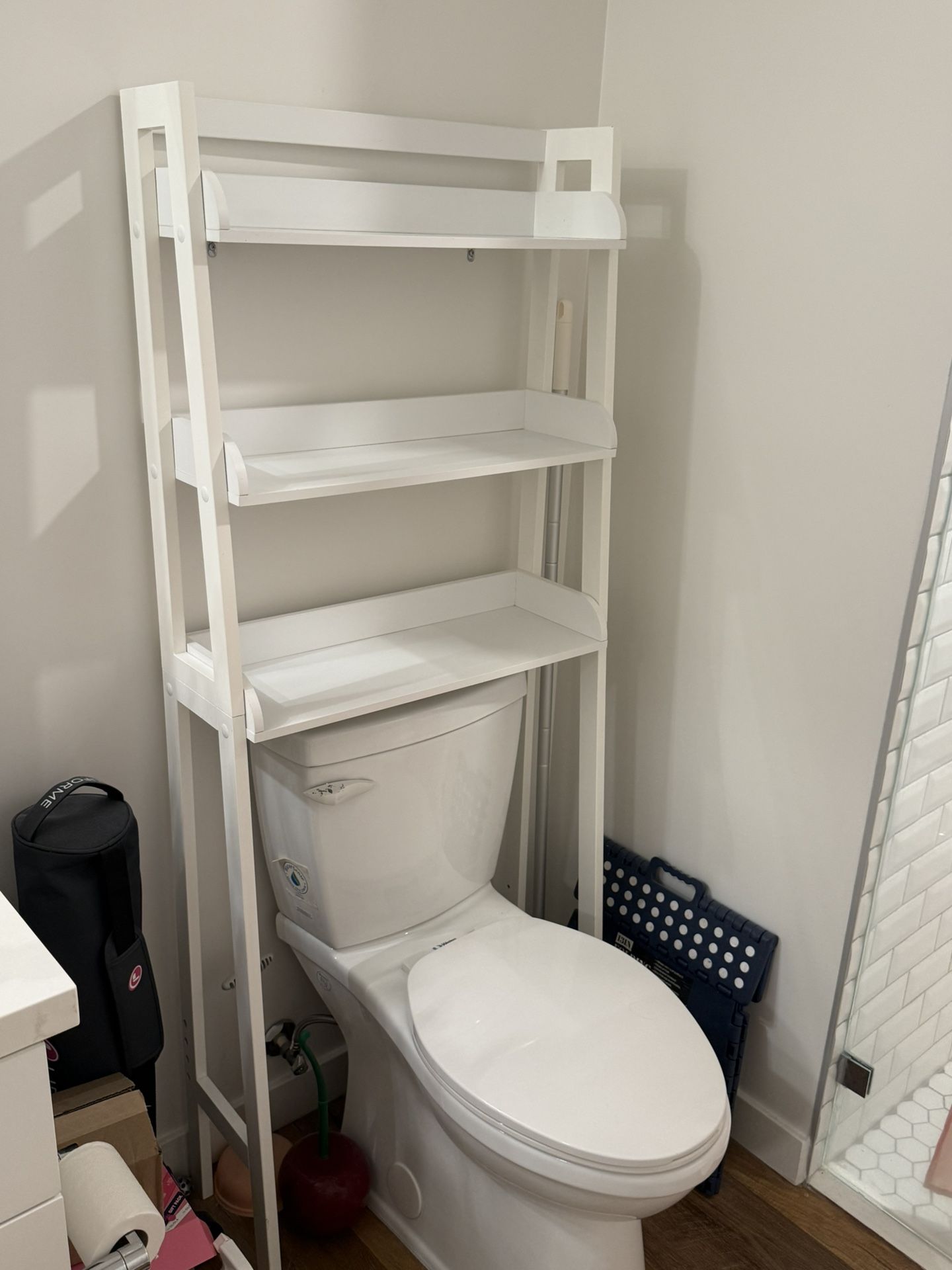 White wooden over the toilet storage stand. Great for bathrooms with no storage. Measurements and scratches are included in the picture. It mounts on a wall as well.
