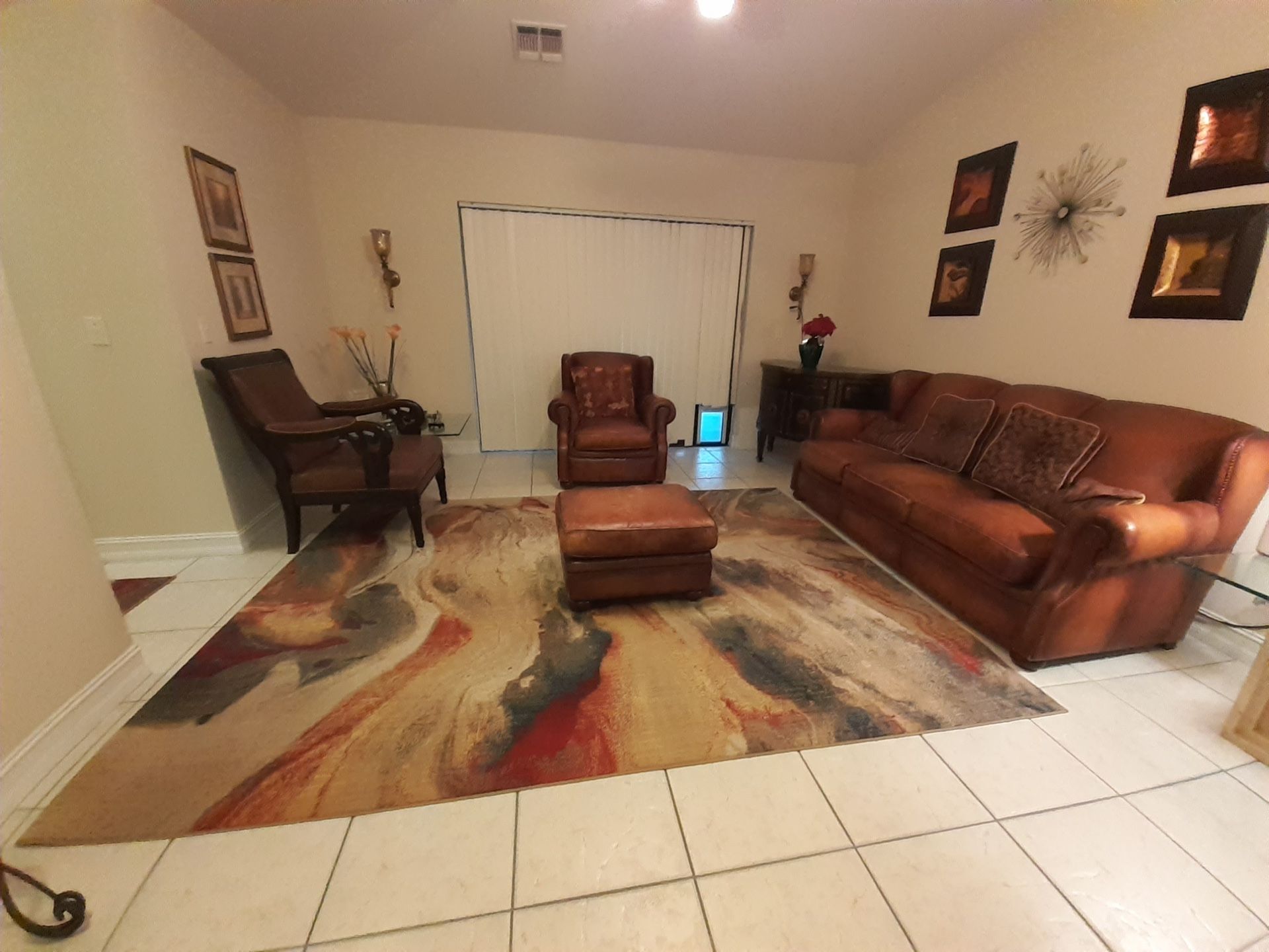 Brown Leather Couch , Lazy Boy Style Recliner Brown Leather, Ottoman Brown Leather , Marble Top Chest style end table , Other Chair in picture , Glass Top End Table Ect…Asking For $600 For All In Picture Rug Too…Wall And Decorations Are Not For Sale.