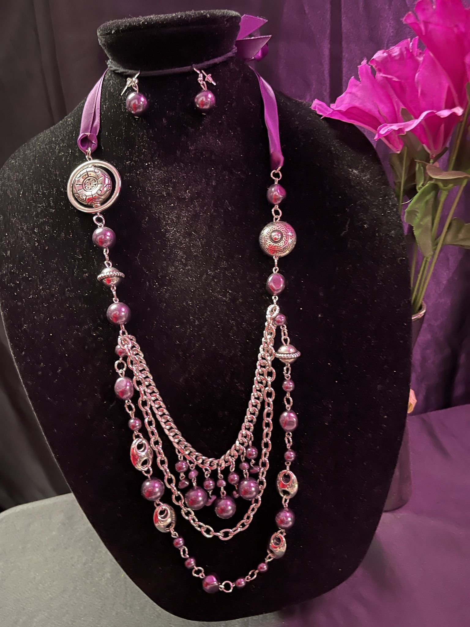 Purple Ribbon Necklace & Earrings Set
