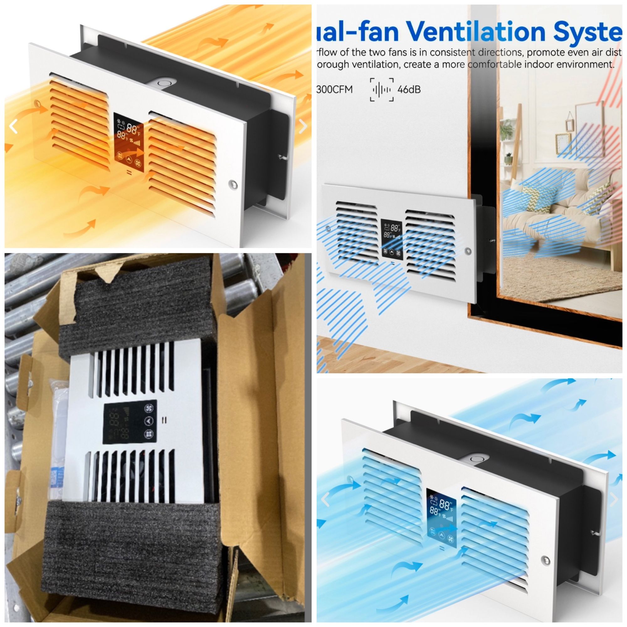 BRAND SPANKIN NEW!! Apexicalo RTR300 Through Wall Fan Room to Room Air Transfer Fan How It Works In Winter:We use “Heating Trigger Mode“ In Heating Trigger Mode, the fan will only activate when the room temperature is higer than your set temperature—This means it pulls warm air to another room. To to raise another room temperature. In Summer:We use “Cooling Trigger Mode“ In Cooling Trigger Mode, the fan turns on when the room temperature is lower than your set temperature, This means the fan pulls the cool air to another room. To reduce another room temperature. Features and Benefits ⚙️INTELLIGENT OPERATION MODES: The intelligent programming function of the room to room fan provides three control modes: cooling trigger mode, heating trigger mode, and continuous mode. You can customize ventilation solutions according to seasonal needs to improve energy efficiency and comfort. 🌀ENHANCED AIRFLOW PERFORMANCE: Featuring dual seven-blade fans, this ventilation fan delivers a robust airflow of 300CFM, optimizing air circulation between rooms without disruptive noise. The two fans produce consistent airflow direction to maximize ventilation efficiency, promote even air distribution and thorough ventilation, and create a more comfortable indoor environment. 💪DURABLE AND STURDY: Constructed with rugged sheet metal housing, this room to room air transfer fan is built to withstand daily wear and tear, ensuring durability and reliability over extended periods. The air duct opening size of the vent fan is 13.8"L X 5.8"H. The through wall fan dimensions is 16.5"L X 4.5"W X 7.6"H. The thickness is adjustable to fit walls with a thickness of 3.8”-7.4.” Note: Measure the size of the duct/drywall opening. 🍃COMFORT SEETINGS: The RTR300 ventilation fan is equipped with a temperature sensor that allows you to select a temperature range of 35°F to 99°F, ensuring customized airflow for year-round comfort. In addition, with five air speed settings, you can fine-tune the strength of the airflow to your liking, striking the optimal balance between comfort and efficiency. 🚶♂️REMOTE CONTROL: Use the infrared remote control to control the wall vent fan from anywhere in the room, enhancing the convenience of everyday use. Additionally, we provide a 1-year warranty with a professional customer support team ready to assist at any time. If you have any questions, please feel free to contact us. You deserve the best after-sales service.