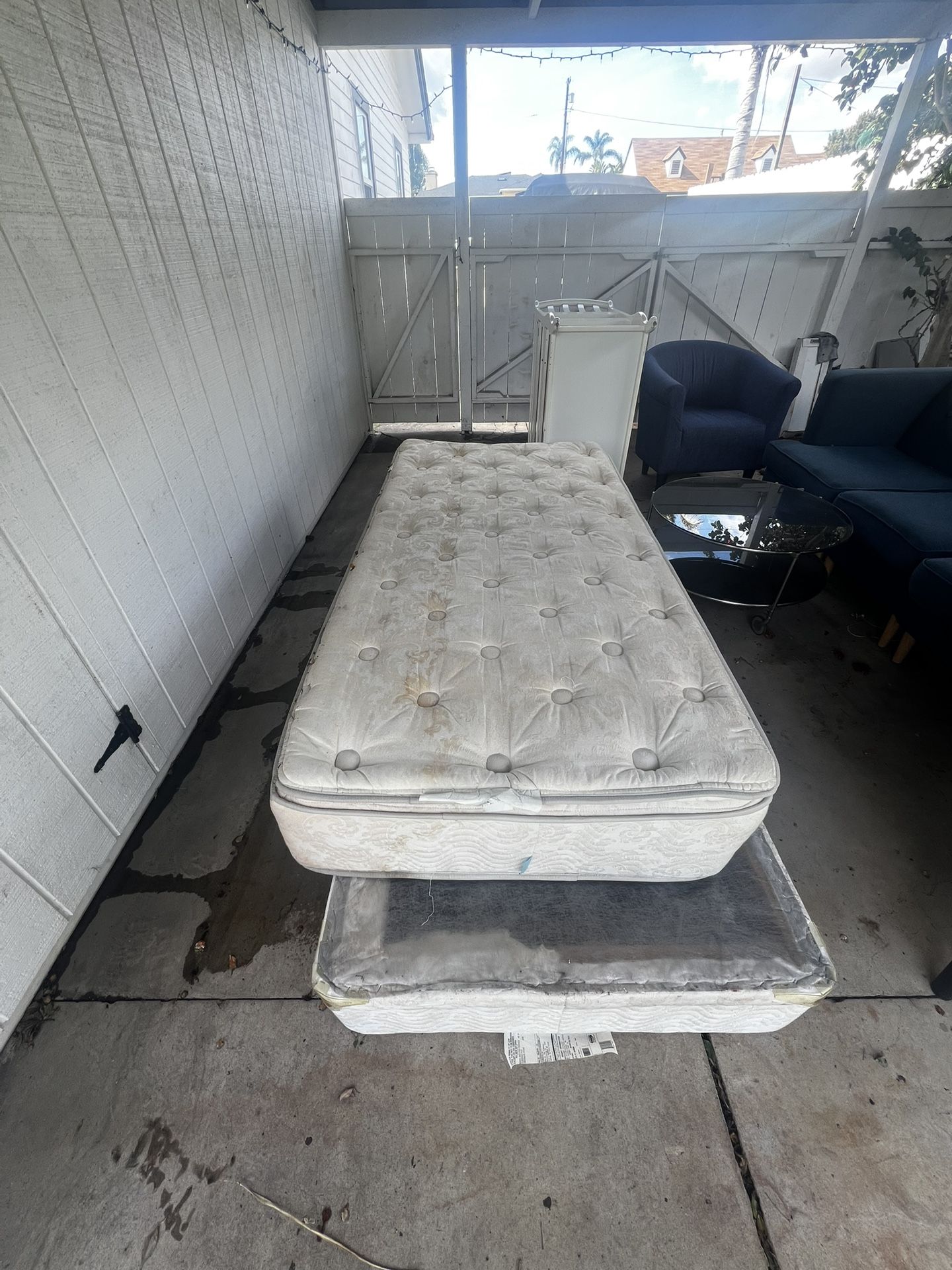 Free twin bed, was planning on throwing it away unless anyone wants it got a little wet on side from rain.