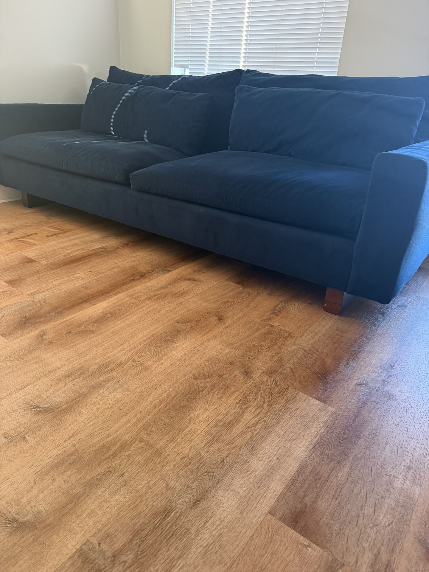 Excellent condition, standard depth. Ink Blue performance velvet with walnut base.