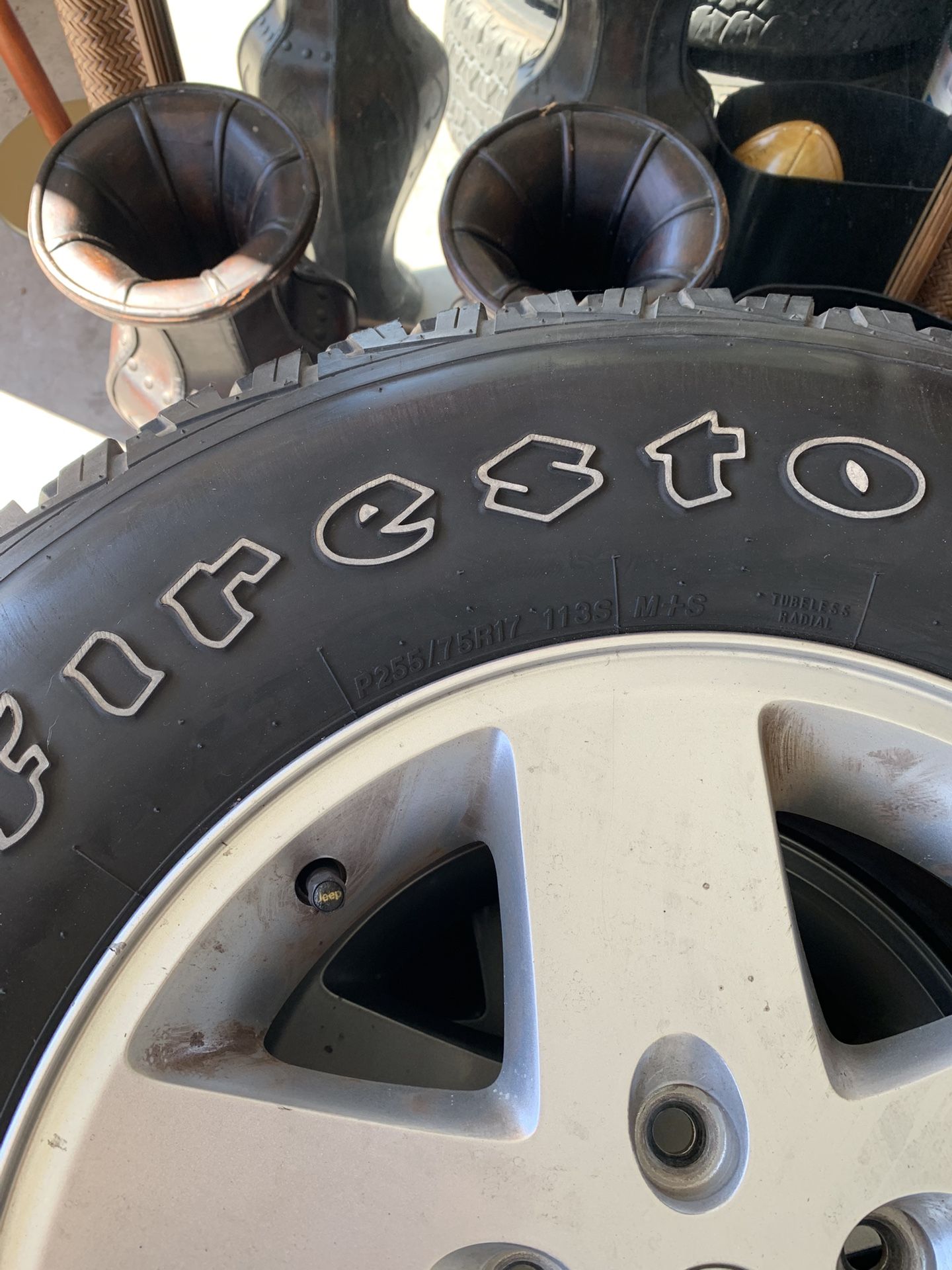 4 Tires P 255/ 75 R 17 1136 M+S. and 4 Rings 17” Aluminum for Jeep , Dodge ,Ram Chrysler , and other. All very good condition.