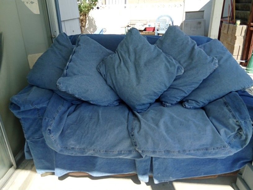 Blue. Jean. Coach. Cover With. 2. Cushion. Covers. And5. Throw. Pillows