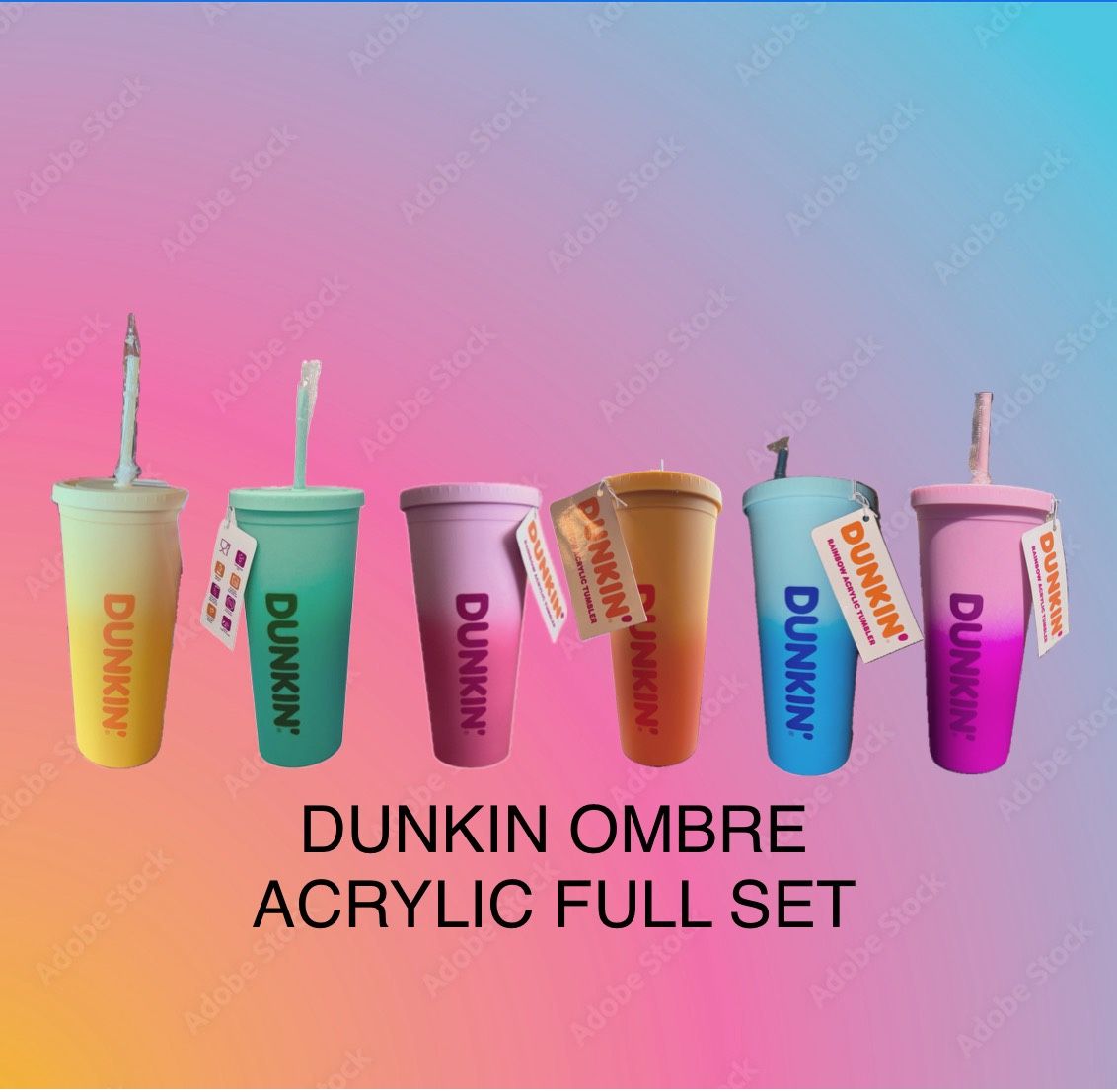 New Dunkin Donuts - 2023 24oz RAINBOW Ombré Acrylic Travel Cup Tumbler SET. This 24oz RAINBOW OMBRÉ COMPLETE SET of 6 acrylic travel tumblers are the perfect addition to your Dunkin' Donuts collection. The vibrant colors and unique design make it an eye-catching piece that is sure to impress any coffee and tea enthusiast. Its size and durable construction make it perfect for on-the-go use, whether you're commuting to work or traveling. ♥️SAME DAY SHIPPING ♥️
