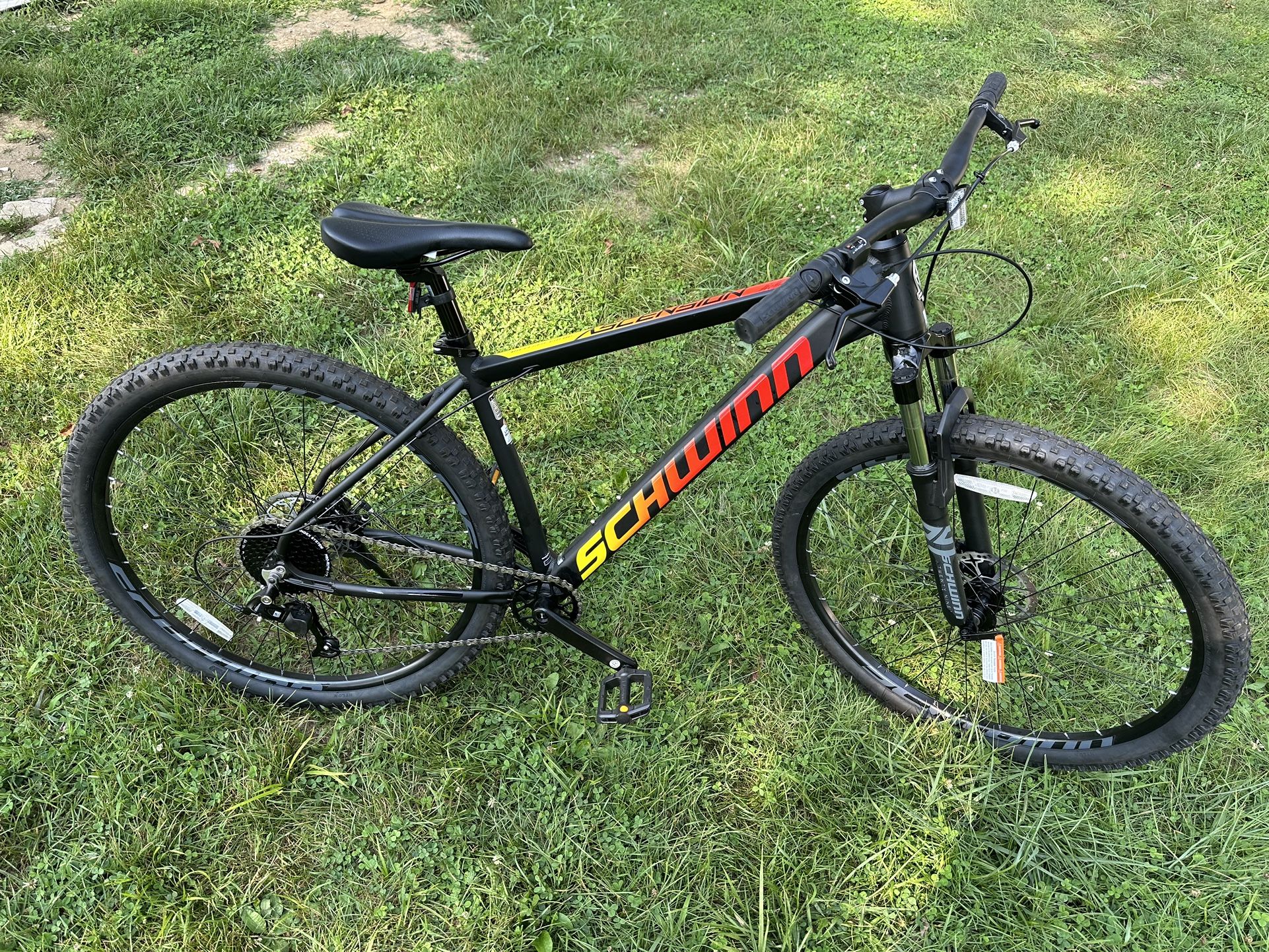 Brand new. Never been ridden. Has been in shed since I bought it. Purchased 4 months ago. Just in a tight spot now. Bought a brand new seat with it for a more comfortable ride. Highlights Aluminum mountain frame with Schwinn suspension fork is built for responsive riding on tough and bumpy trails Pro Rush 7 speed shifter and rear derailleur with clutch offers precise gear changes Front and rear mechanical disc brakes provide crisp all-condition stopping Light and strong alloy rims provide added durability for everyday riding Big 29er all-terrain mountain tires roll over anything in your path Fits riders 5 feet 9 inches to 6+ feet tall Specifications Dimensions (Overall): 74 Inches (L), 42.51 Inches (H) Weight: 32.54 Pounds Holds up to: 250 Pounds Suggested Age: 14 Years and Up Bicycle Frame Material: Aluminum Gear Speeds: 7 Rim Material: Aluminum Pedal Material: Resin Seat Material: Vinyl Assembly Details: Adult Assembly Required, Tools Not Provided Includes: Kickstand Wheel height: 29" Tire Type: Knobby Bicycle frame size: 18.5" Rear Brake System: Disc Tire Width: 2.35 Inches Bicycle Frame Type: Step-Over
