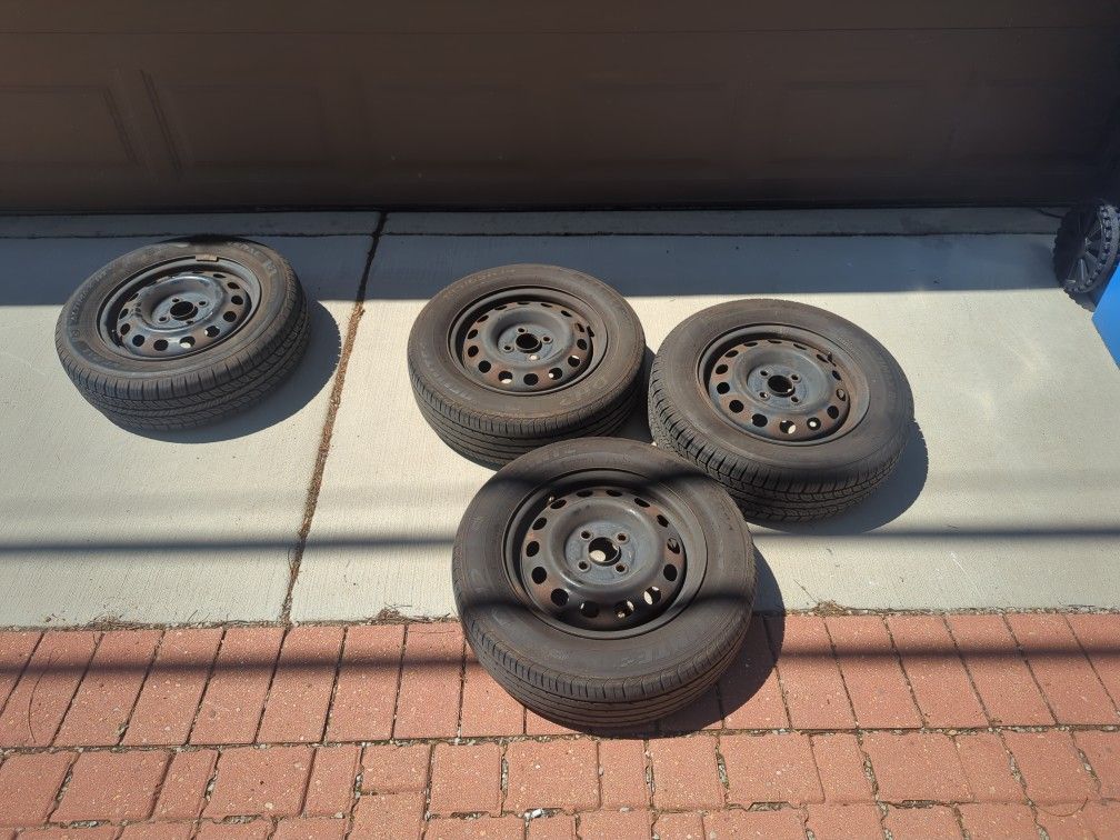 4 good tires size 185/65R14, 3 good 14" steel wheels in 4x100 size. One steel wheel is damaged causing air to leak from the tire. All four wheels are from my 2000 Civic LX.
