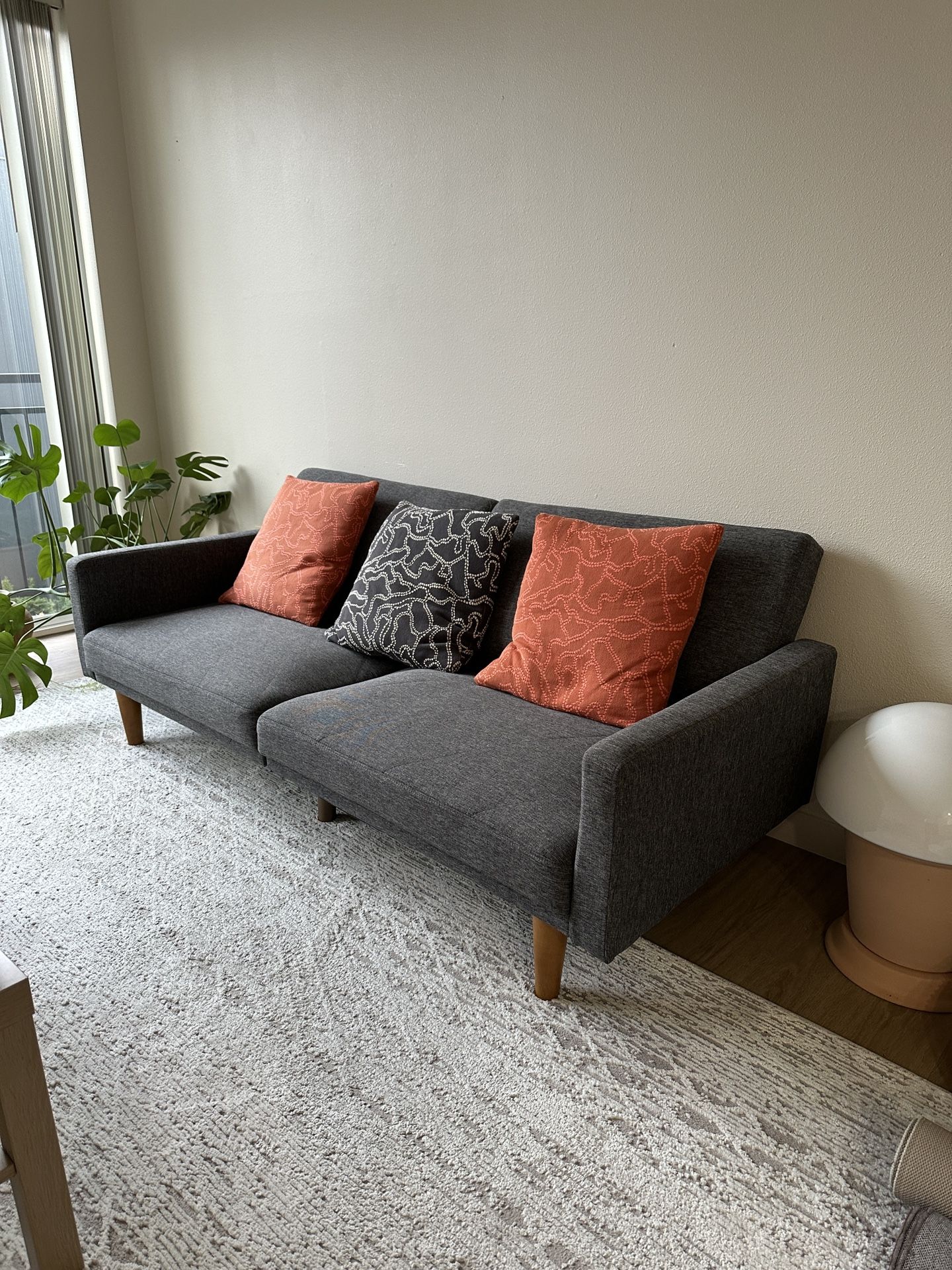 Moving very soon, need to get rid of the couch. Smoke free, pet free house. This couch has been lightly used as we have 2 couches. There are 6 legs on the couch. One on each corner and 2 in the center but one of them in the center towards the back side broke so it can’t be used as a futon too well but the couch is still very stable in the seating position.
