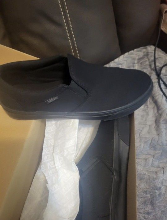 Brand new black Van slip ons. Never worn. Never stepped in. They definitely won't fit me so no sense in even trying. Have way too many shoes and hopefully these can go to someone who appreciates them and brand new shoes at a major discount.