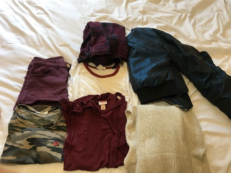 American Eagle shorts (0) PacSun flannel (small) PacSun camo shirt (small) Forever21 jacket (medium) Hollister cardigan (medium) Forever21 tshirt (medium) Red tank top (small)