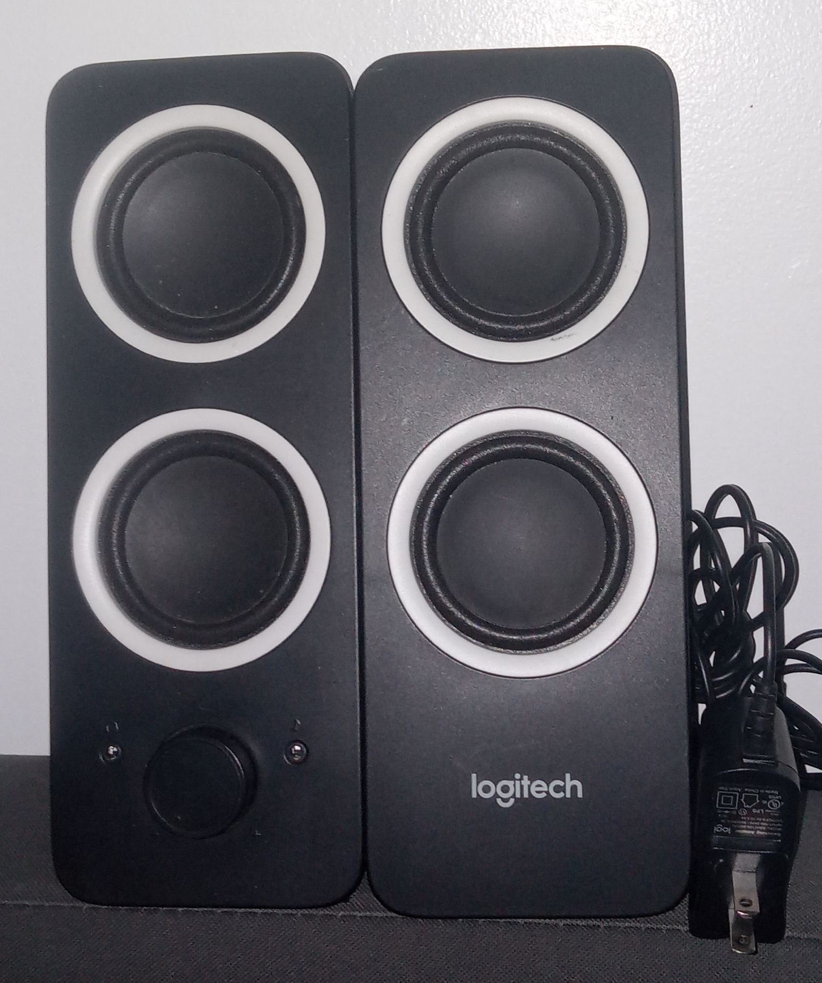 Black LOGITECH Z200 PC Speakers Stereo Sound 10 W peak power 2 × 3.5 mm input headphone jack. adjustable volume control. Can be used for PC/ TV / Smartphone and Tablet. USED- WORKS WELL comes with cables. Approx H 9.48 in. x W 3.54 in. Depth 4.88 in. Lightweight enough to be easily moved but have a sturdy built quality with rubber feet on the stand to keep them stable. Please see all pictures as they are part of the description. Please note: I accept many best offers. Local pickup. If post is up it's still available.