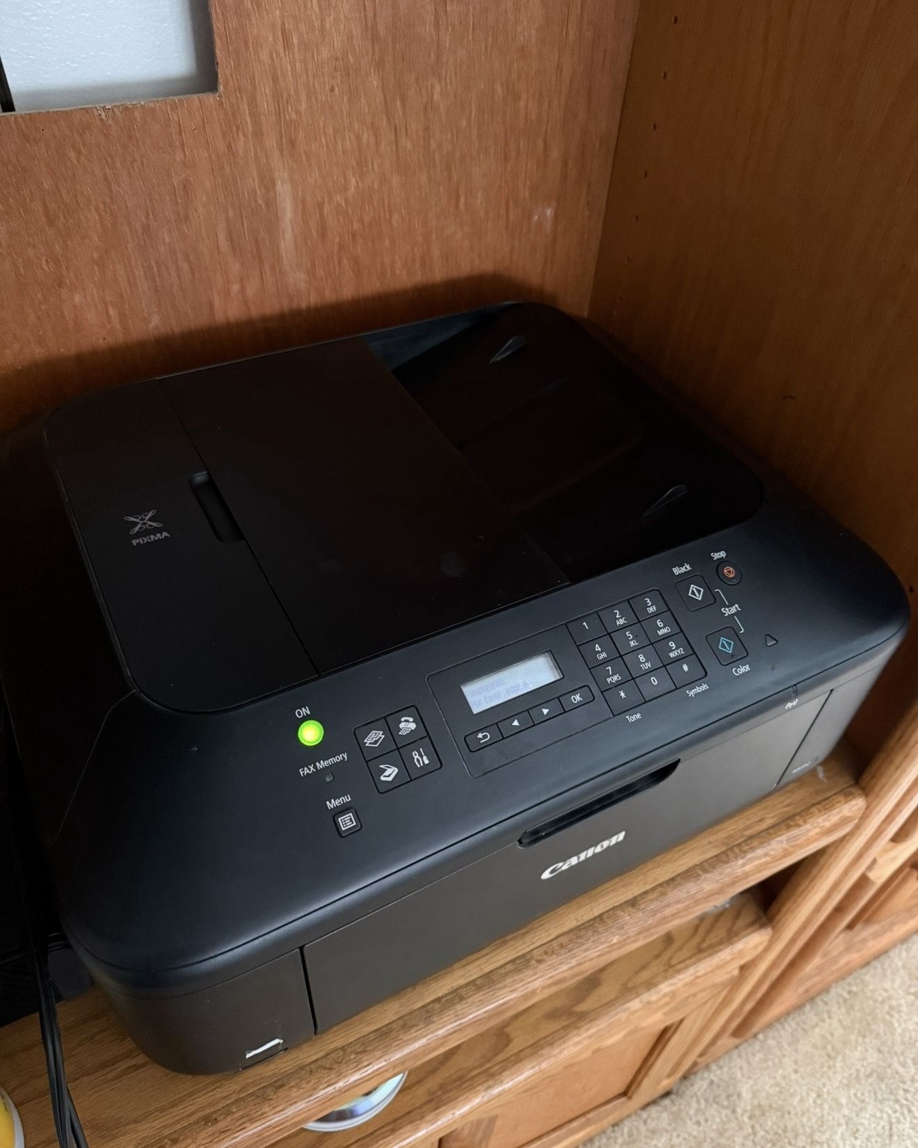 Canon PIXMA MX452 all-in-one printer (print, copy, scan, fax). Everything works great except for the paper feed rollers — it doesn’t automatically pull the paper in, so you have to guide it a bit manually. Once the paper is in, it prints fine. ✅ Includes power cord 🖨️ Has some ink left (about half full) 📶 Wi-Fi connection works 🧼 Overall in good condition