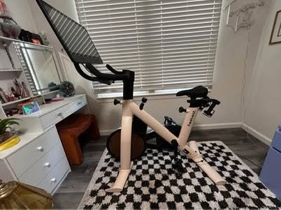 Freebeat Lit Bike stationary bicycle in color “Moonbow Beige”, like brand new without any issues. Comes with one set of 3 lb weights. I only used it twice and decided it wasn’t for me! Comes with the touch screen tablet, and requires a monthly subscription to use the classes.