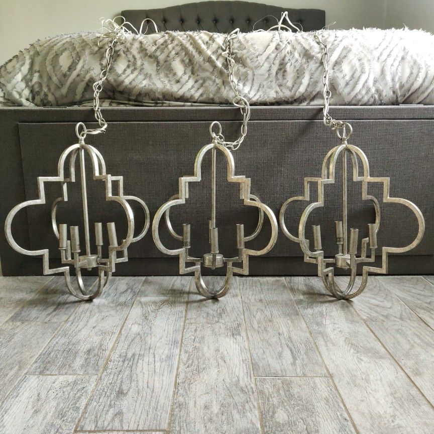 Capital lighting Ellis Modern candle style pendant, mini chandelier This listing is for THREE pieces, each originally $398, they are in excellent condition Model # 4541AS Sloped ceiling compatible UL rated for dry locations Fixture height: 20.25" Fixture width 18" Ways approximately 5.5 lb Requires four bulbs (bulb base Candelabra (E12)) light bulbs not included. Max watts per bulb: 60 watts Asking $398 for all three, OBO