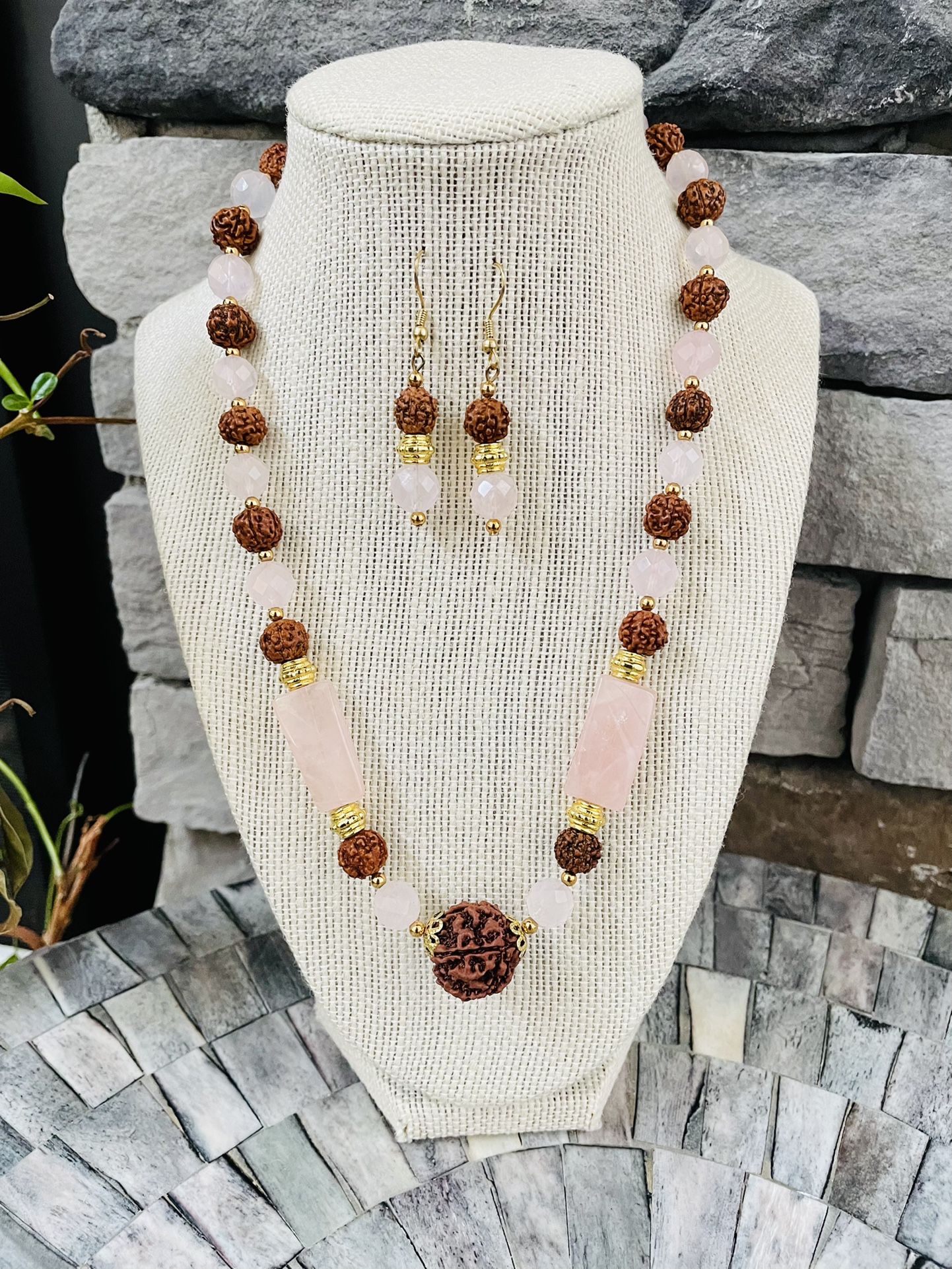Rose Quartz and Rudraksha Necklace And Earrings Set
