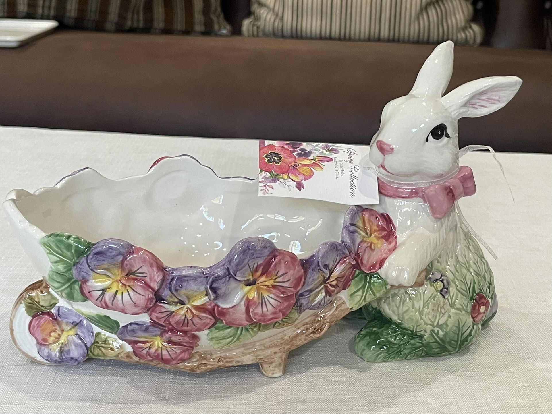 Corner Ruby ceramic bunny wheelbarrow planter with floral decoration.