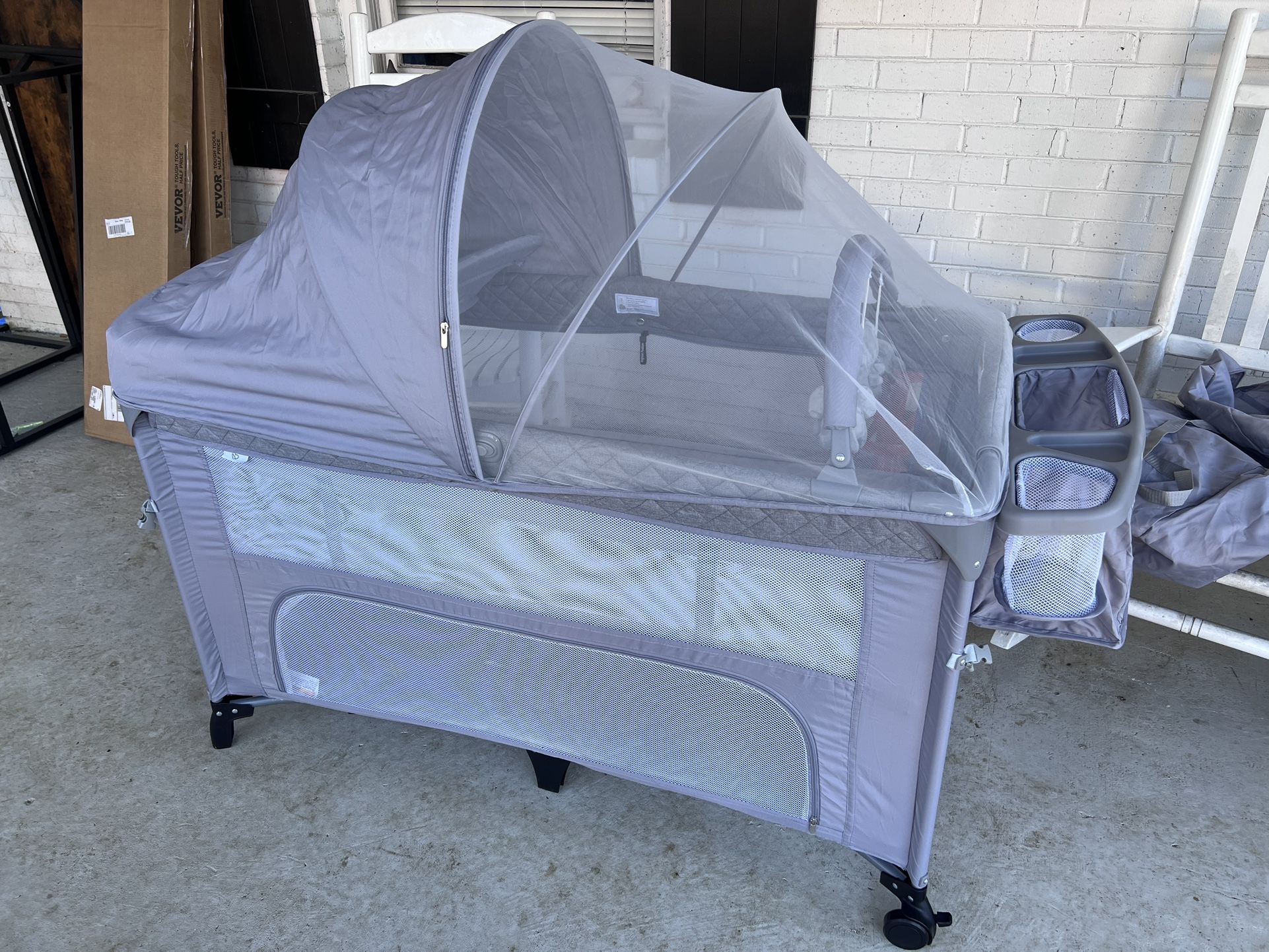 4-in-1 baby pack & play including bassinet, mattress, canopy/netting, and side storage. Clean, sturdy, and fully set up. Smoke-free home. Local pickup only.