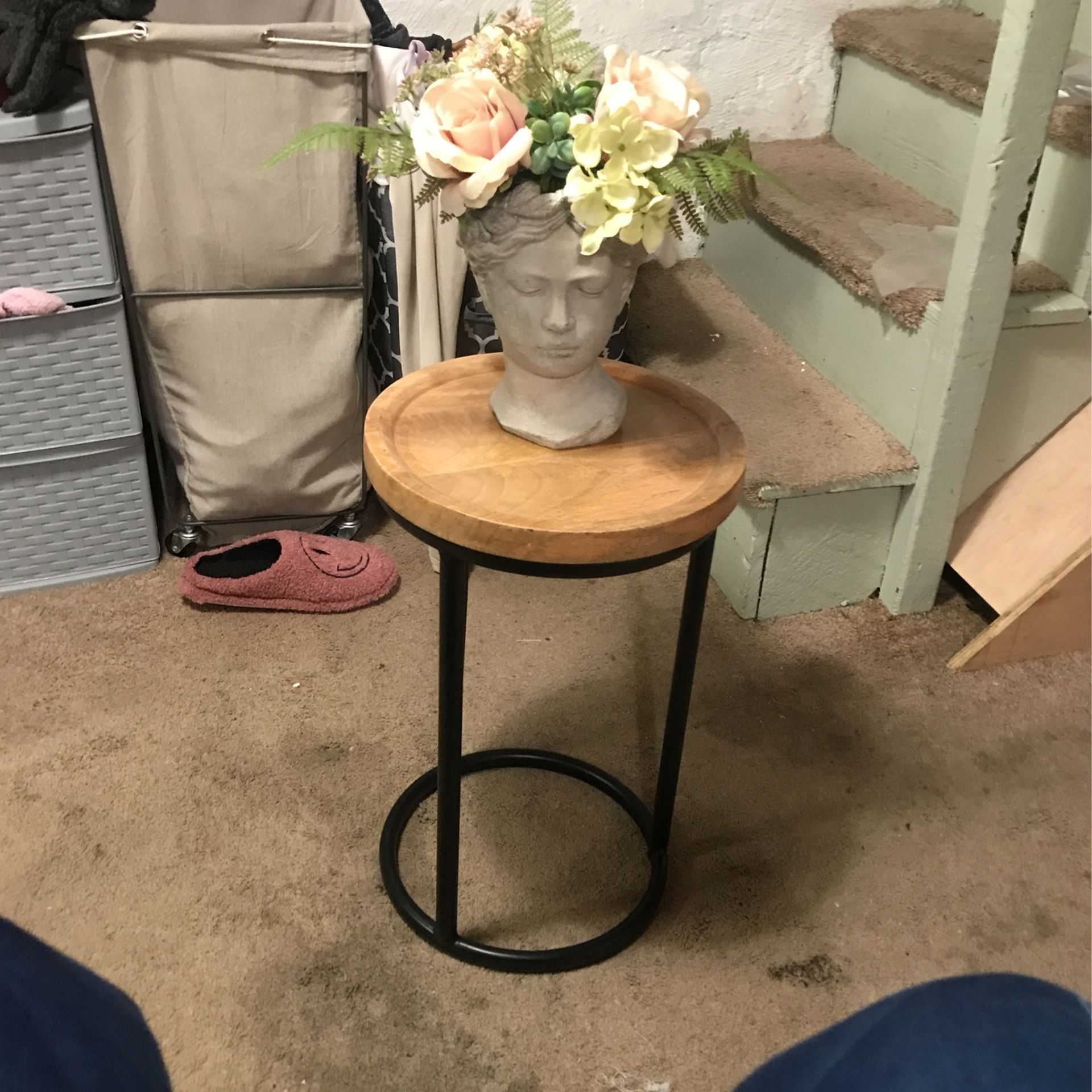 Wooden table base black metal comes with artwork Greek lady with flowers sprouting from head