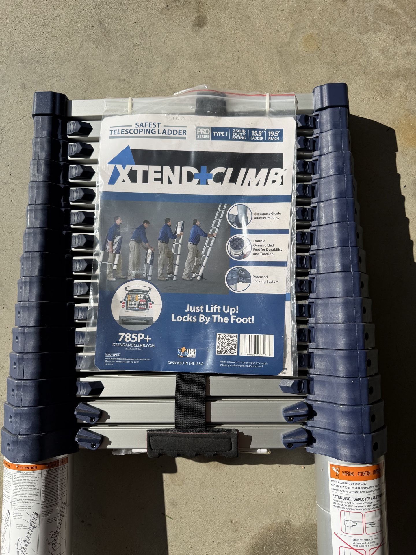 Brand new collapsible ladder still in original packaging.