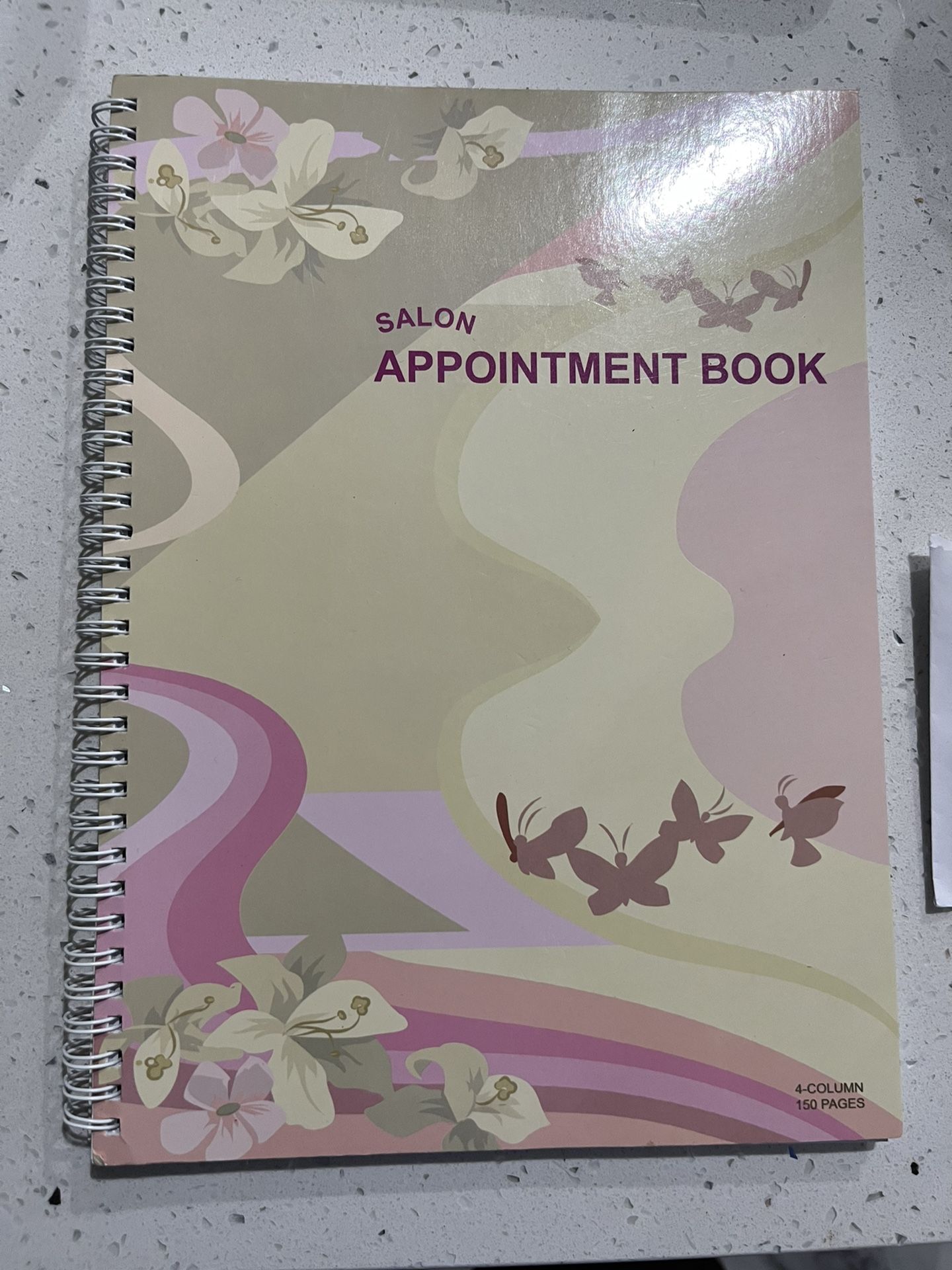 Brand new salon appointment book (4-COLUMN 150-PAGES). Fine quality appointment book features selected paper of heavy and white stock, and beautiful cover design. Time column ranges from 8 am to 8pm with 15-minute division. Column header contains date and name of stylish blocks. Number of pages: 150 Cover: Heavy stock gloss paper Inside page: 24-lb extra white Inside cover: Calendar & notepad Public meet up in Royal Palm Beach or i can ship for an additional charge.